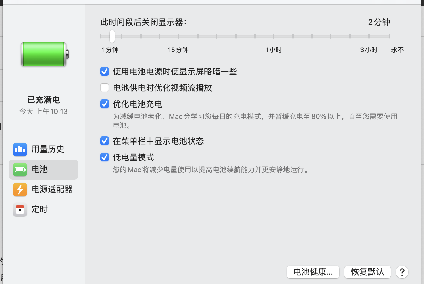 如下图,这个地方的关闭显示屏时间不论我调整成多少,关掉之后都会恢复2分钟。