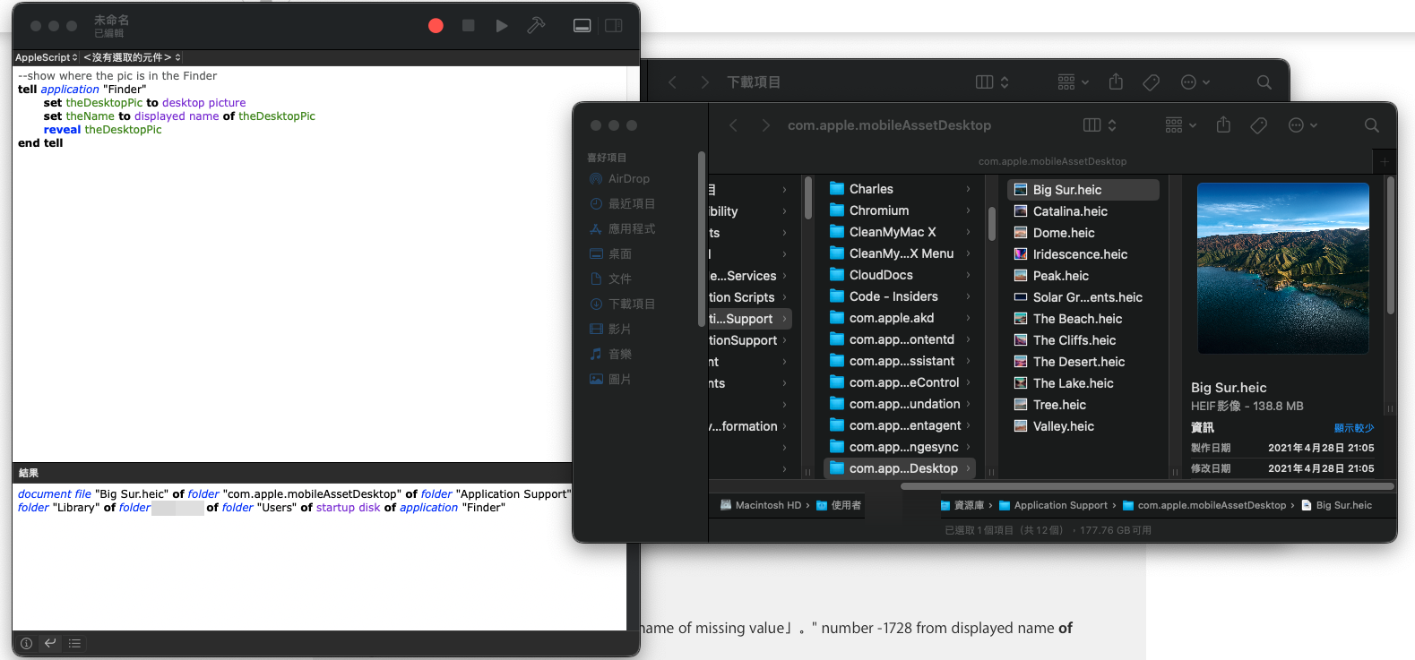 建立了一个.command文件,输入 OFFSET 0 命令,得到了正确结果。虽然没有 AppleScript 的 reveal theDesktopPic 那么直接那么酷,还要再自己复制终端结果再次搜索一遍(Finder搜索还挺麻烦的)找到对应文件,但是确实解决了我的提问。感谢您的正确答案。