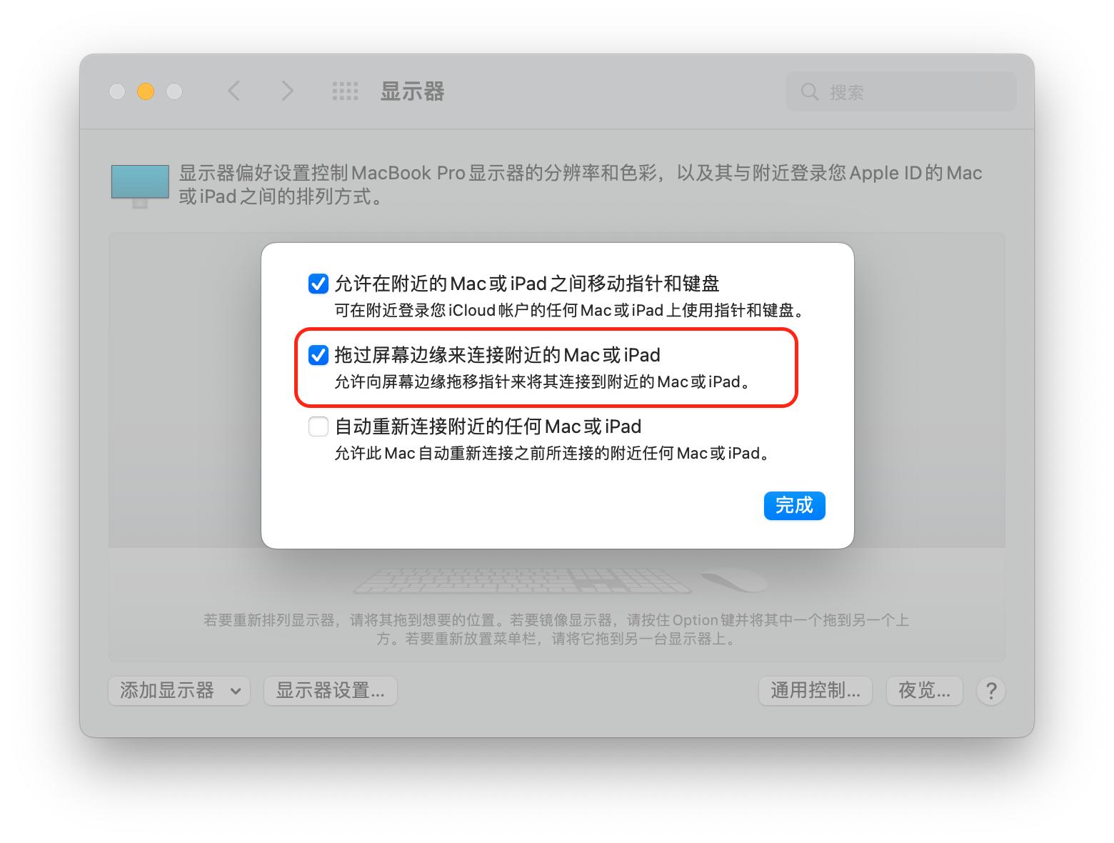 你可以在 Mac 上打开“系统偏好设置”,点击“显示器”,点击“通用控制...”,取消勾选“拖过屏幕边缘来连接附近的 Mac 或 iPad”。以此来防止在使用“随航”功能时误触发“通用控制”功能从而导致“随航”功能中断。