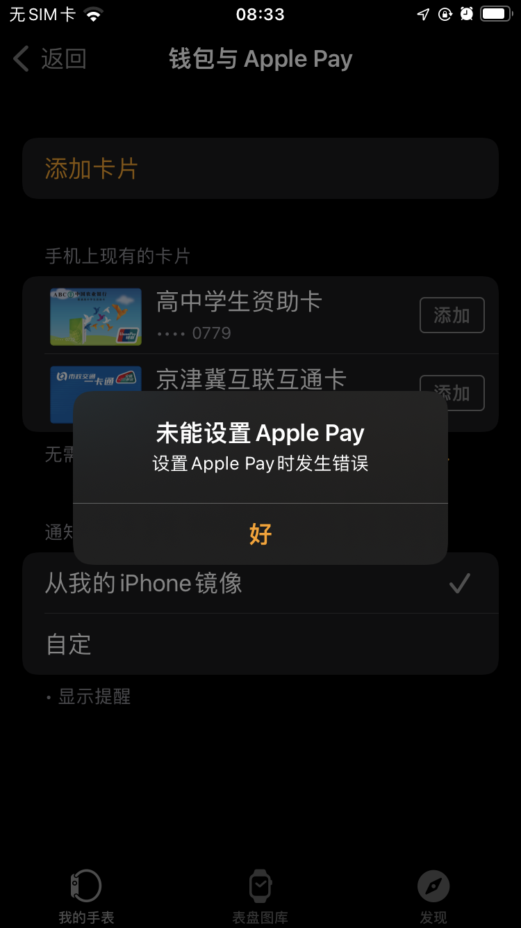 watch 不像手机一样有apple pay 的图标了而且添加卡的时候会出错在手表上也添加不了 手表为二手美版蜂窝5代 手机为美版