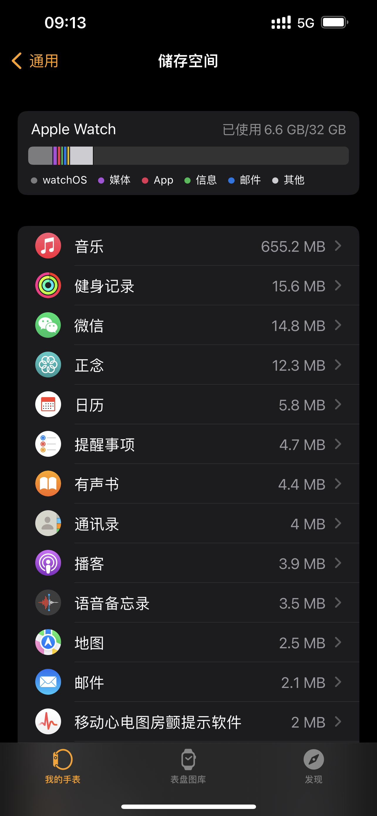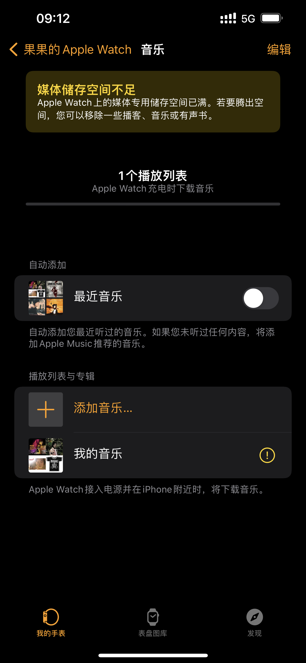 同步音乐到手表上,显示媒体储存空间不足,Apple Watch 上的媒体专用储存空间已满。若要腾出空间,您可以移除一些播客、音乐或有声书。手表内存明明剩余还有25G内存!
