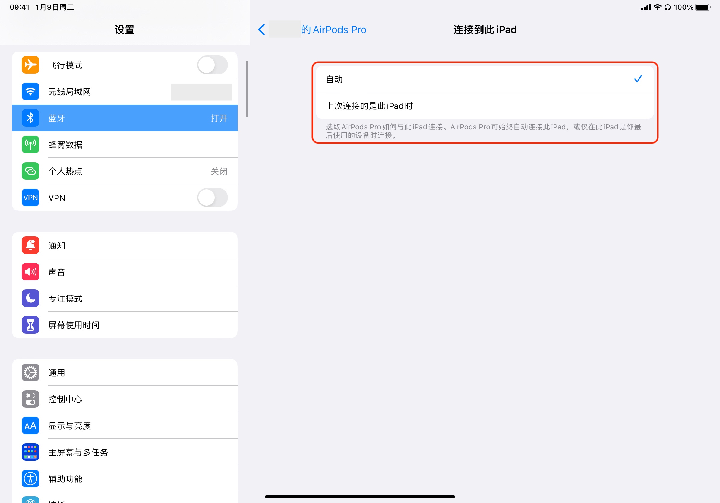 前往“设置”>“蓝牙”,轻点此 AirPods Pro 后方的选项符号“ⓘ”,轻点“连接到此 iPad”,并选择“自动”。