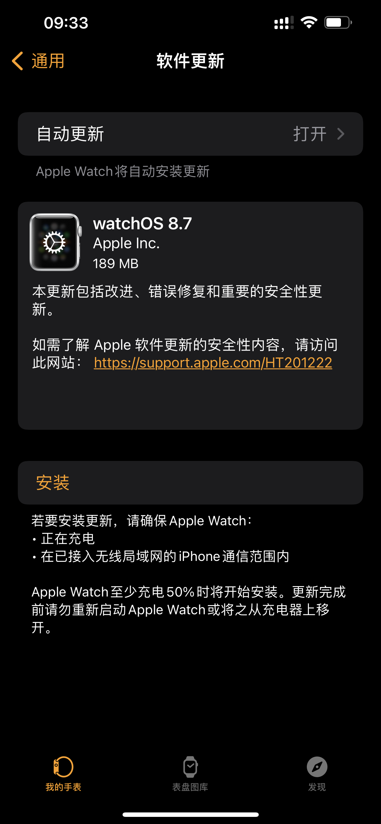 2、打开Watch App,轻点“设置”>“通用”>“软件更新”> 下载并安装更新,然后等待更新完成。
