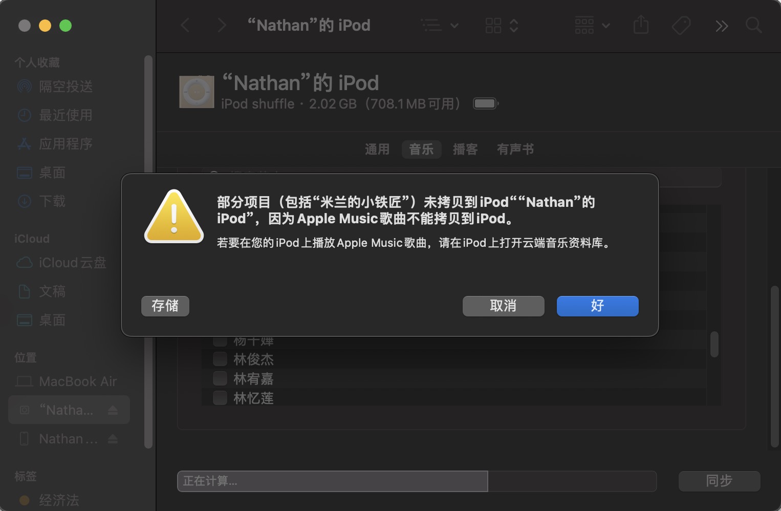 偶然翻出几年前购入的iPod shuffle 4 ,于是想要重新同步一下歌单,连接的设备是M1芯片的Macbook Air,但总是同步失败。详情如图。请问该如何解决?