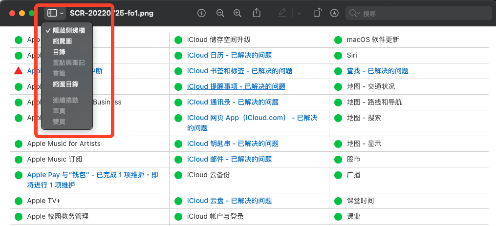 我在使用Mac的预览时讲隐藏边栏打开,后来想关闭无法关闭?求解答