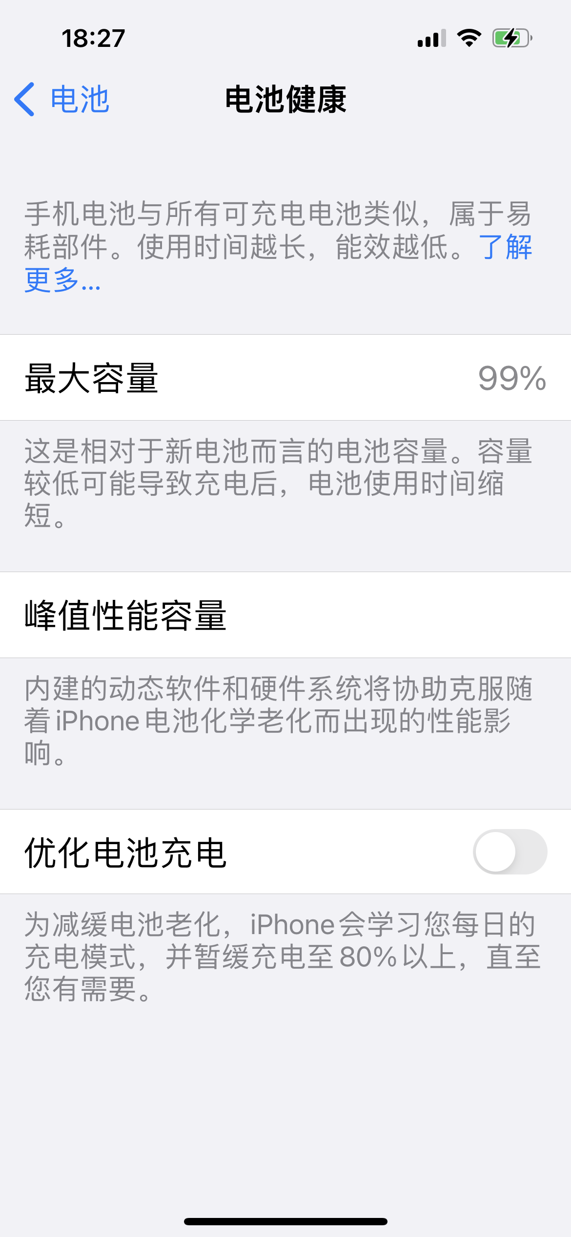 在您设置 iPhone 或更新至 iOS 13 或更高版本后,“优化电池充电”会默认开启。要想关闭这个功能,请前往“设置”>“电池”>“电池健康”>“优化电池充电”。