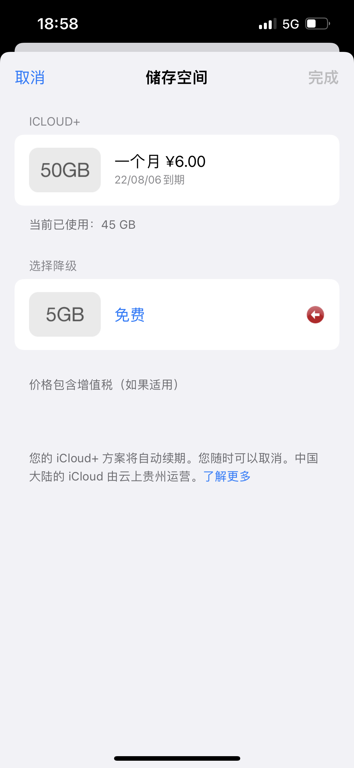 这个截图就是已经降级了, 因为之前钱已经给了, 所以当前订阅周前还会保留是 50GB, 而当前订阅到 2022/08/06 过期后, 就自动回到 5GB 了.