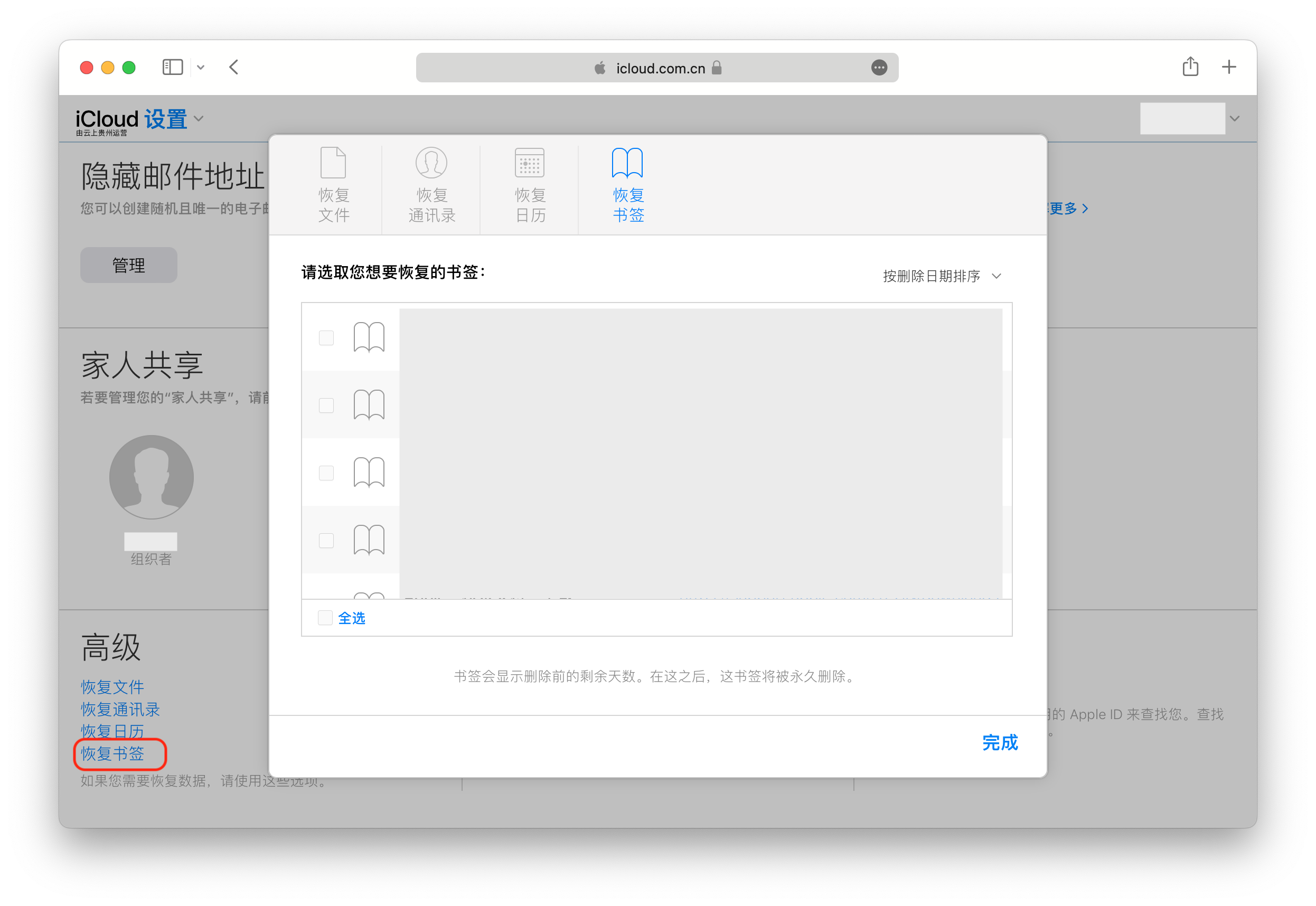 请登录 iCloud.com.cn,点击右上角[你的姓名]后方的箭头,选取“账户设置”,滑动至页面最下方,并在“高级”中点击“恢复书签”。然后选取你需要恢复的内容并点击完成。