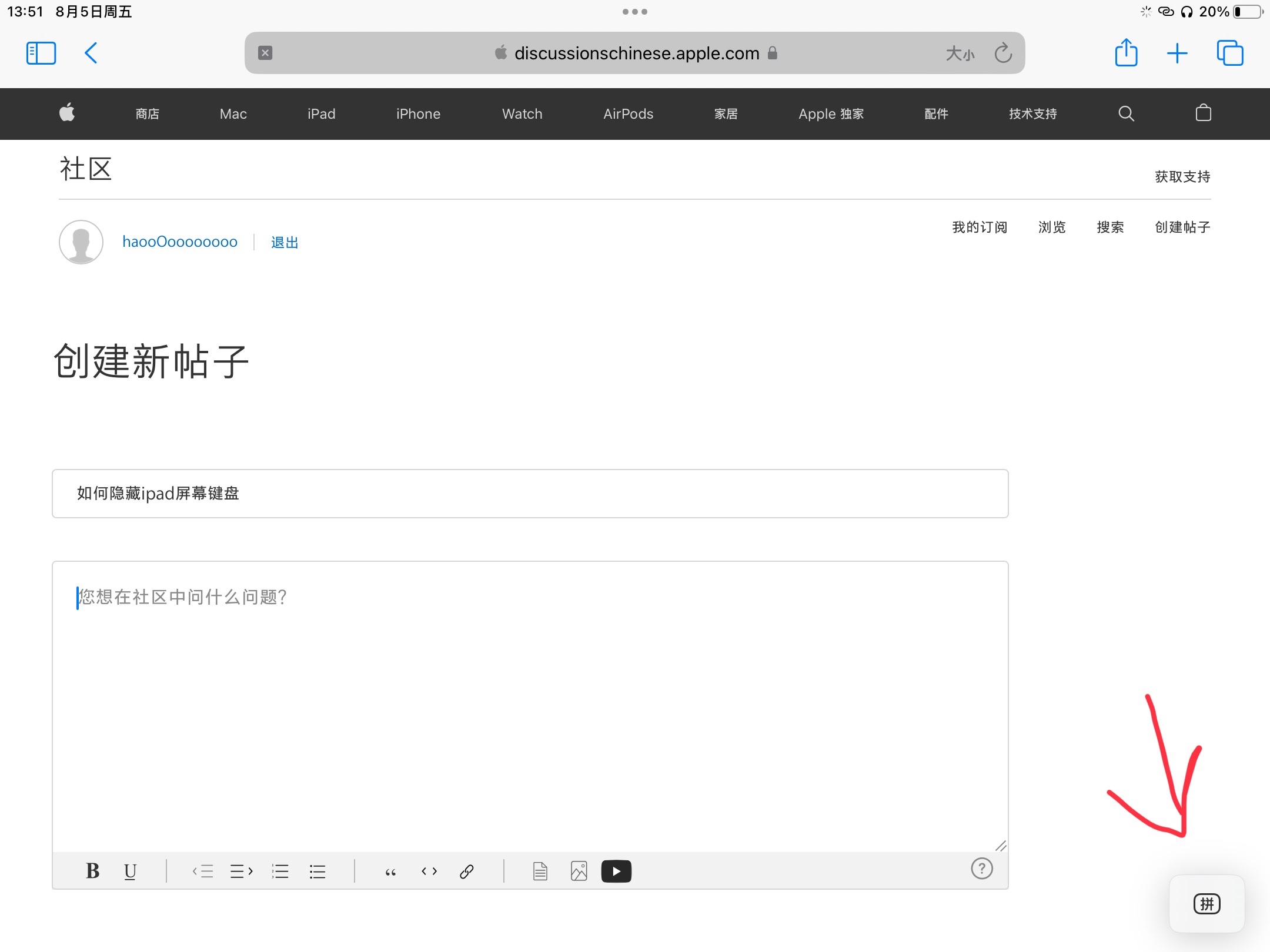 ipad连接蓝牙之后,屏幕会显示一个辅助输入的框(我也不知道应该叫什么名字,就是图中标出的这个东西),这个框会导致遮挡,并且会独自占用一个格子,导致在某些网站上把其他内容挤开。