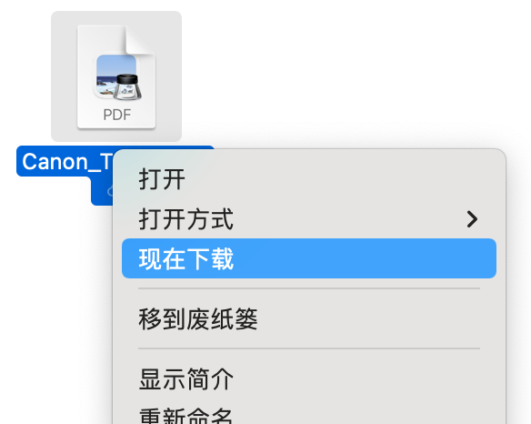如果下载看上去完全卡住了,可以双指辅助点按(鼠标右击)尚未下载的文件或文件夹图标,并选择“现在下载”。此时选中的文件应该会立刻开始优先下载,文件名下方会有一个下载图标,一旁会有剩余的文件大小信息,在访达左侧边栏的 iCloud 云盘图标后方也会显示一个圆形的进度条。