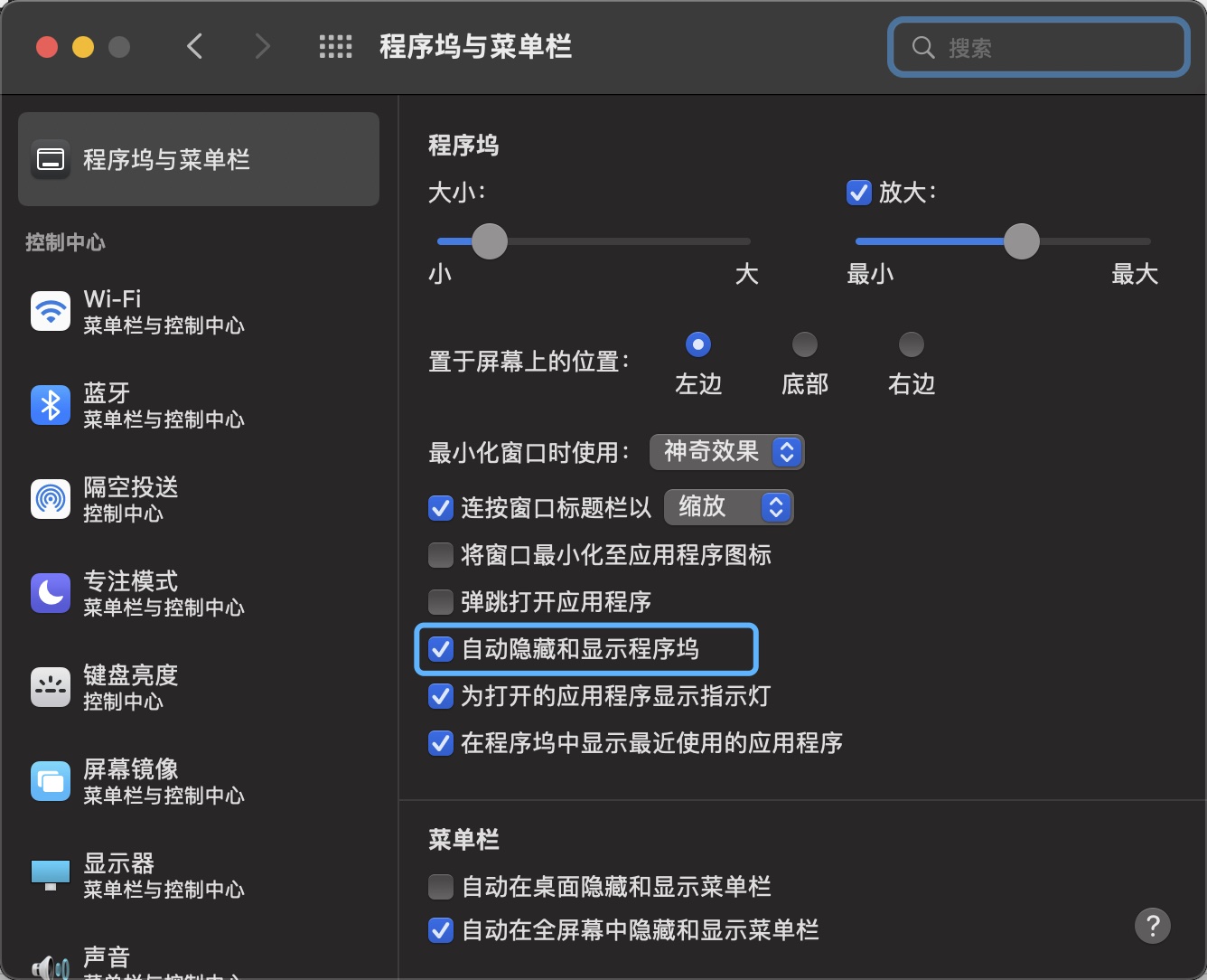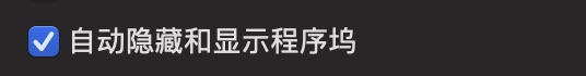 后来不想隐藏程序坞了,就把此项取消勾选。但是发现了个问题,取消勾选后,程序坞正常显示出来。但是用几分钟后,它又自动隐藏了。再去设置里面看,该项变成了勾选状态。重启无法解决,当时是macOS Big Sur版本,我现在升级到了macOS monterey版本还是有该问题。
