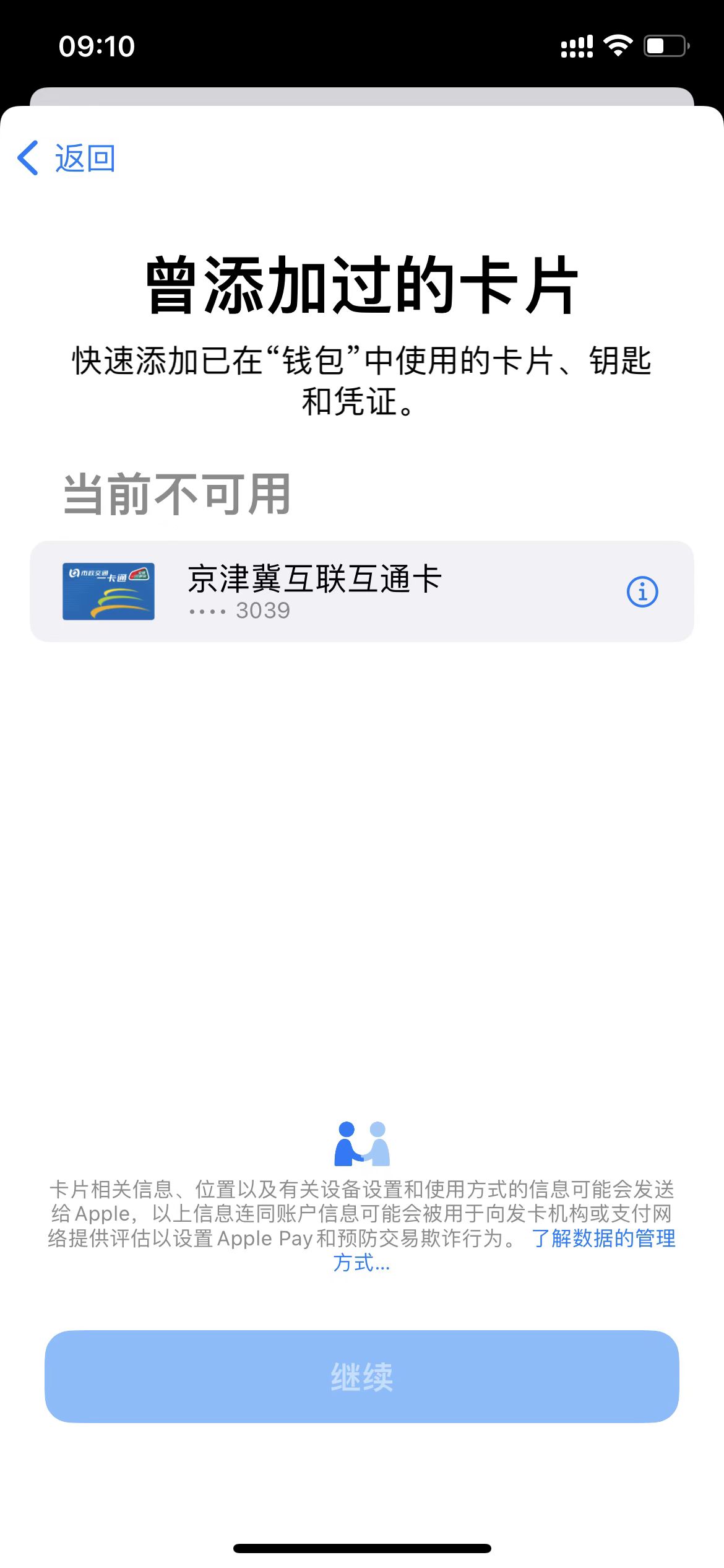 iphone12 钱包内,8月下旬移除“市政交通一卡通”公交卡后,9月5日重新添加该卡片时提示:“无法独取旧设备中的卡片信息,因此无法添加此卡”。
