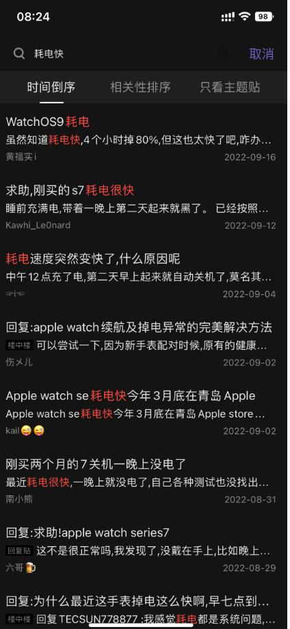 9/13早上升级最新watchos 9系统,8点上班电量是75%,中午发现电量销号非常快。第一时间联系客服,回复说新系统需要等48H后。我想我明天还会打电话。晚上做了实验,睡前充满100%,大约在晚上22点左右,早上70:1分看手表剩余电量只有 20%, 非常夸张。原来一晚上放置大约耗电20%内。手表有重启。。其他除了升级系统也没有其他的变更设置。太崩溃了