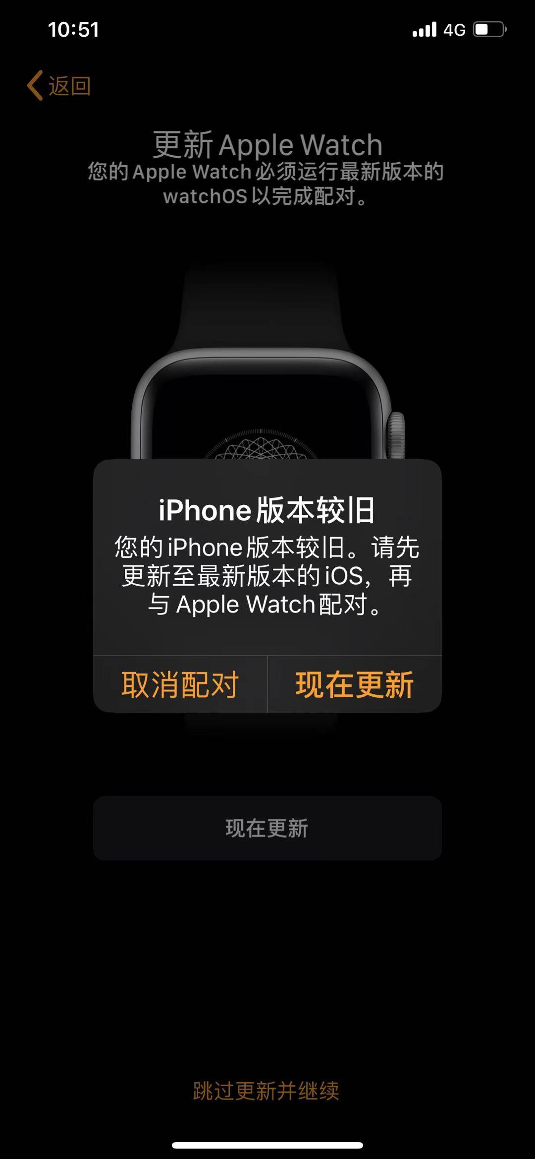 大佬好。最近在配对时遇到了无法成功配对的问题。因为手机是18年买的xsmax,所以不想更新ios系统了。手机ios版本13.1.3;手表是S4,watchOS 8版本是6.3。在网上查应该是可以匹配的。但是在进行操作时,有时候会提示“iphone版本较旧,需要更新ios才可以配对”【图1】,一般这样子我都是取消配对重新连接。有时候会提示“更新Apple Watch”但是可以跳过更新并继续