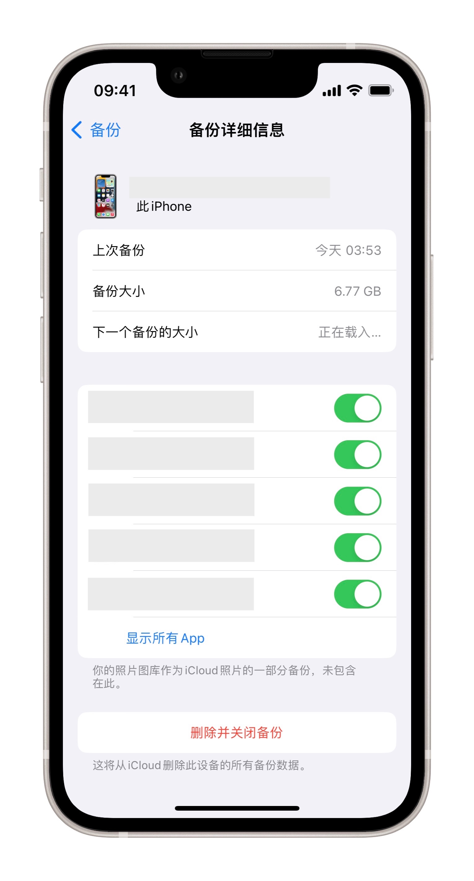 对于备份内容的管理需要前往特定设备的“备份详细信息中”,只有在完成一次完整备份之后才能显示并管理,并且此处也不提供“通讯录”的开关选项。