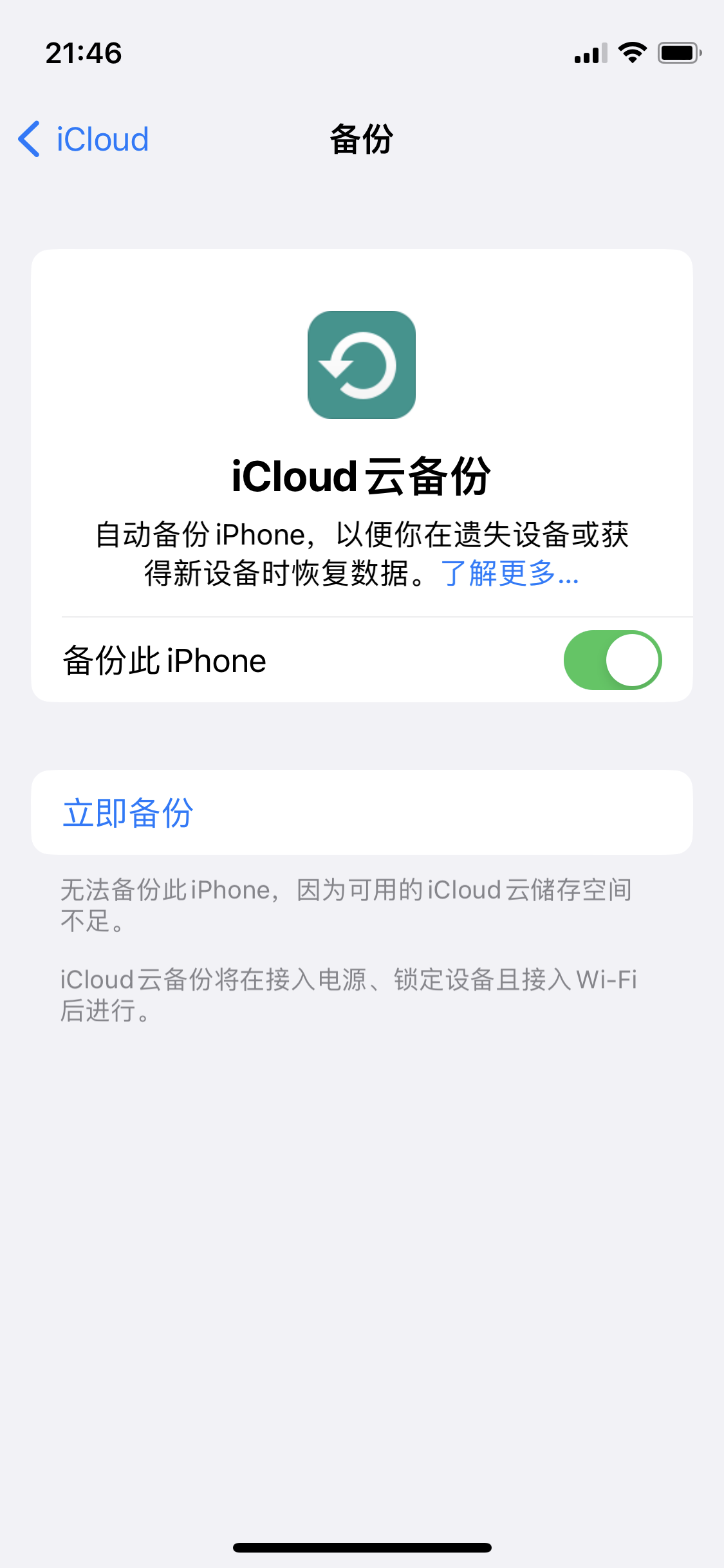 你好,考虑有可能是一次完整备份的预计大小超出了 iCloud 的剩余空间,所以会直接提示空间不足。你需要升级 iCloud 空间,或适当在设备上移除一些内容以减小备份的大小。