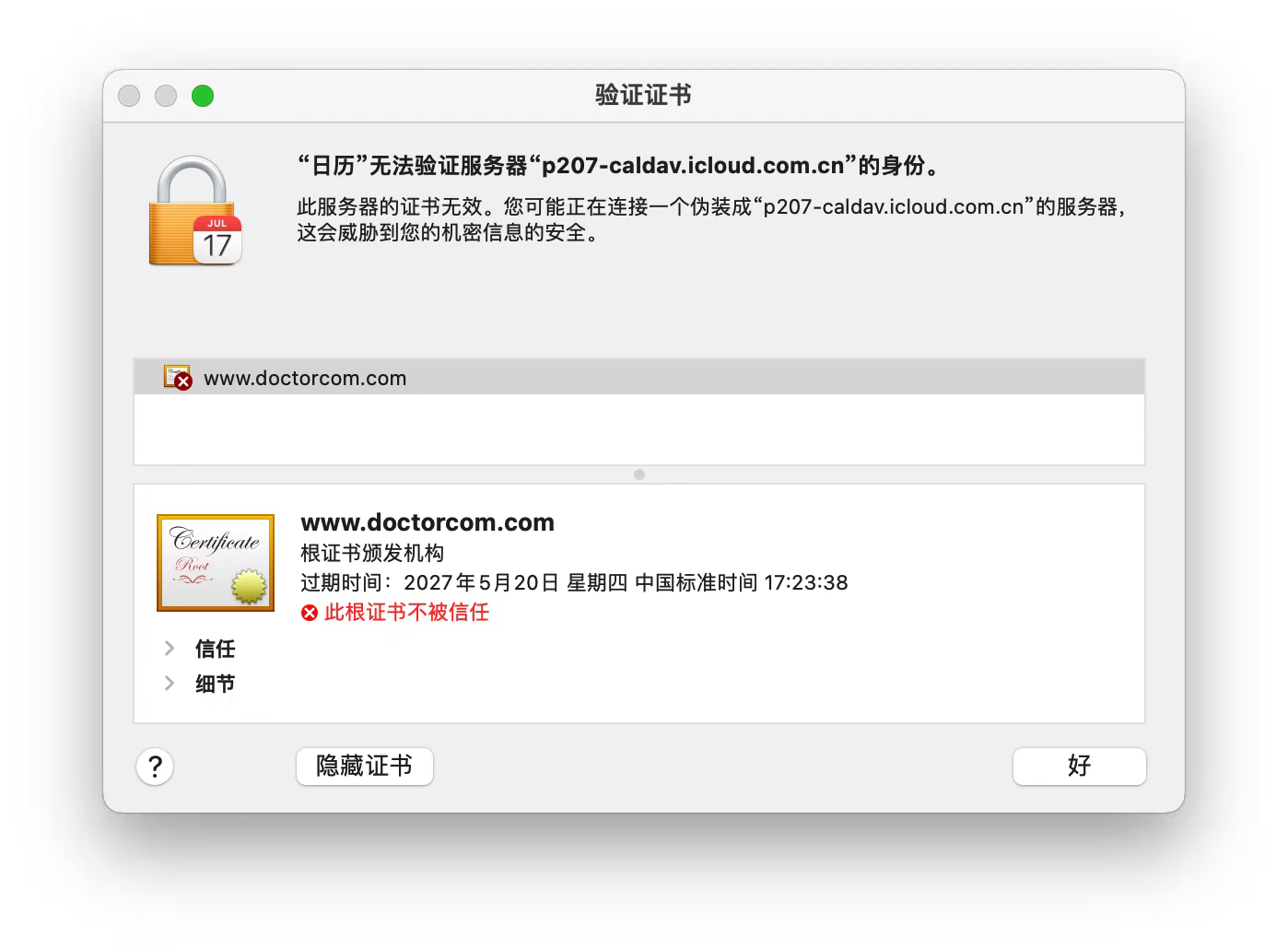 “日历”无法验证服务器的身份