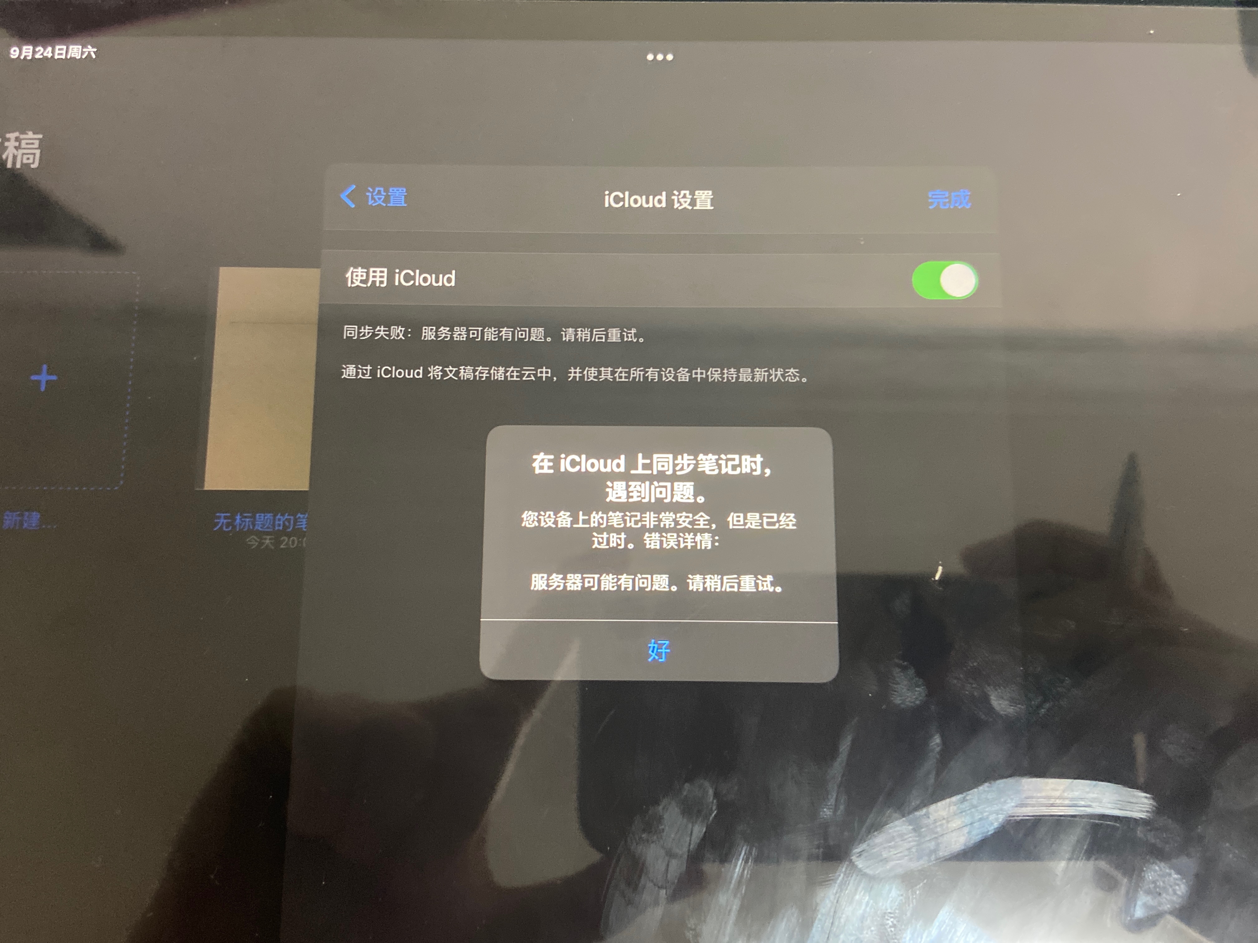 icloud中有goodnotes的备份 但是goodnotes却不能正确同步 且打开同步iCloud时显示“服务器可能有问题。请稍后再试” 并弹出下列提示。但使用其他笔记软件时可以正确备份,另外我的icloud储存空间充足,且网络状态良好