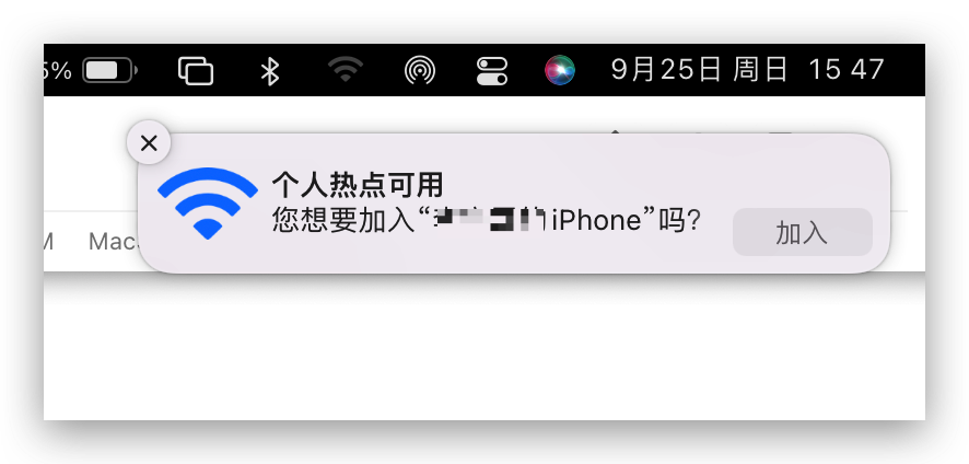 Macbook 发现了个人热点可用,弹窗通知后如果点击加入,均无法连接。只能在顶部WiFi或网络设置中选择连接。此问题是否有解,能方便发现后点击即可