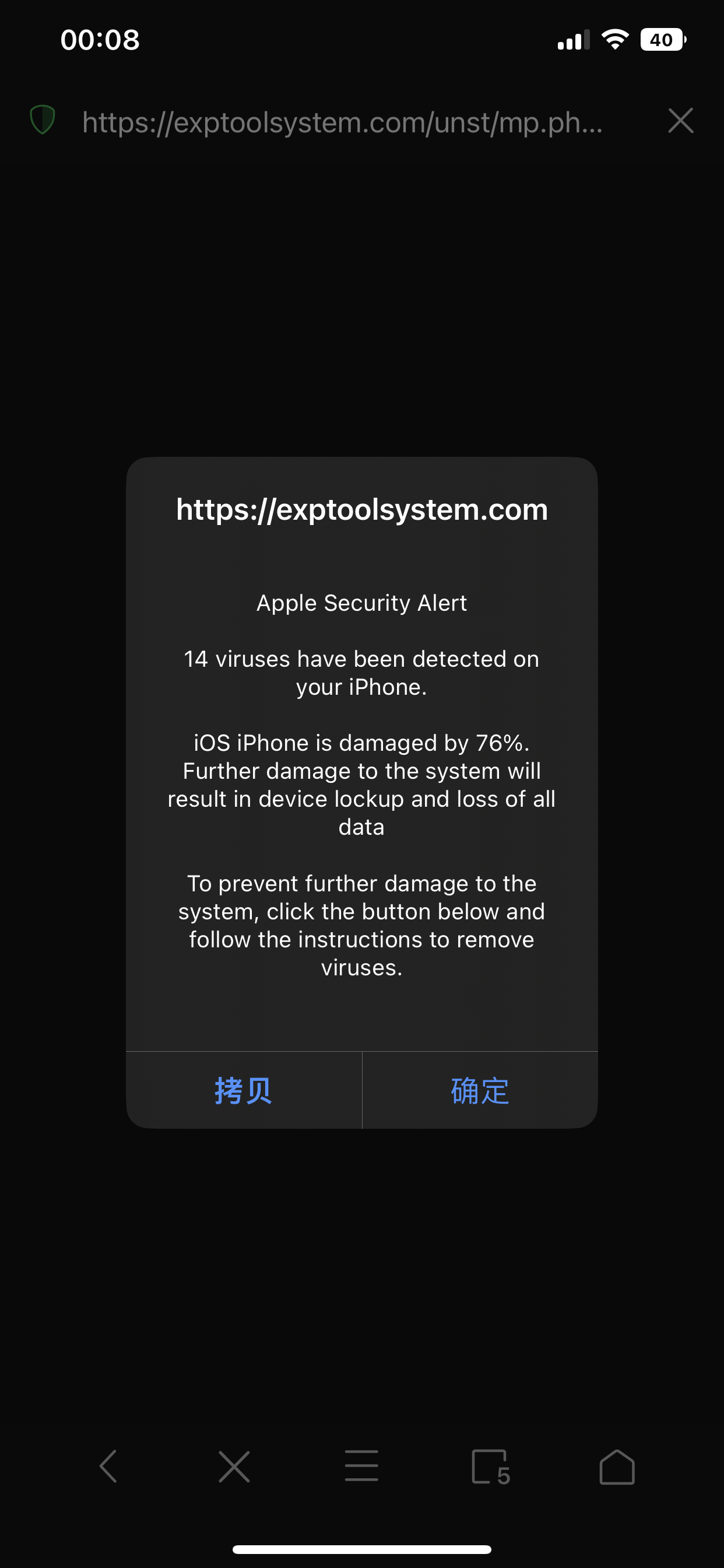 你好,看弹窗最上面的标题,这只是此网页推送的弹窗,与 iPhone 本身以及 iOS 系统均无关。部分网站可能会用此类方法,使用博人眼球的虚假信息误导用户,以此进行引流。直接无视这个消息并退出当前页面即可。