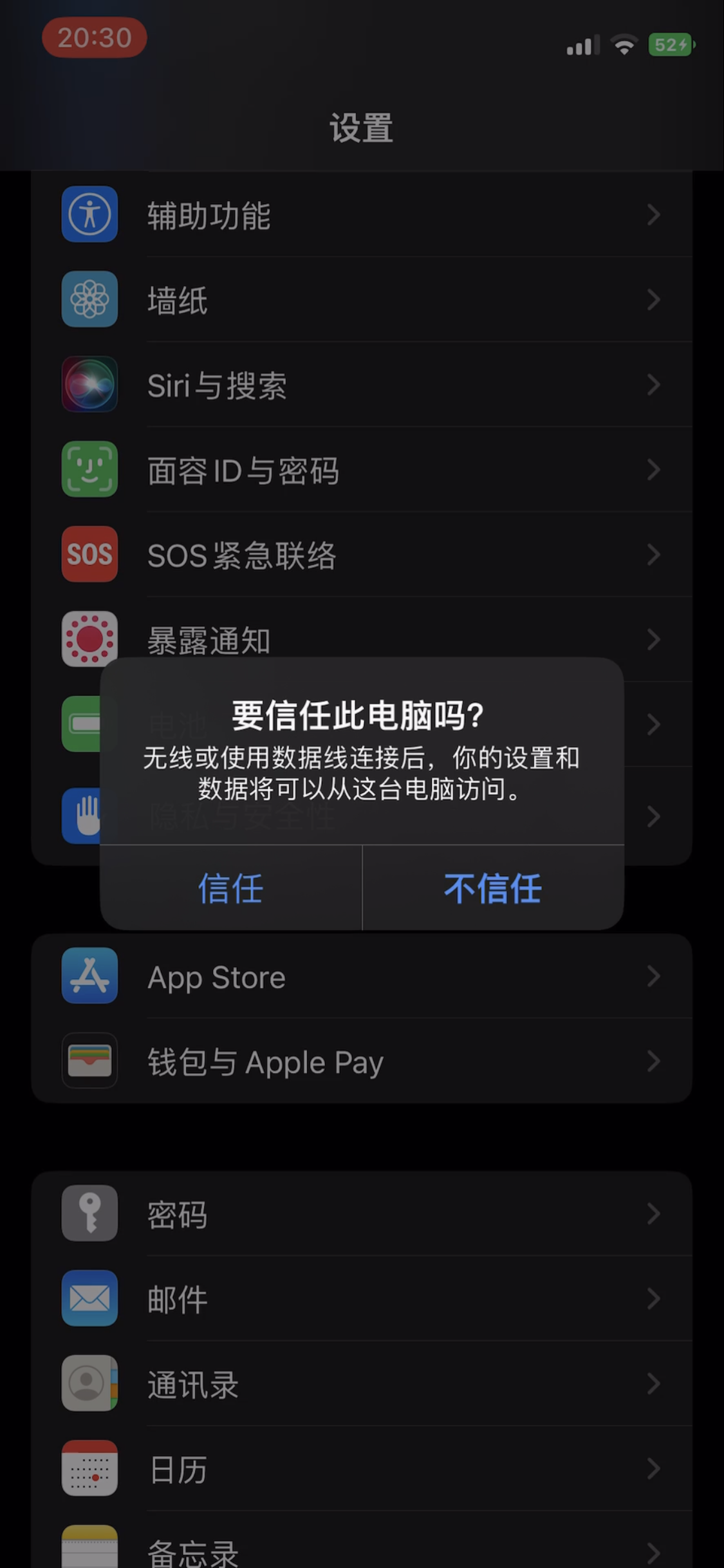 问题描述:使用数据线试图连接iPhone和Mac时,iPhone上就会不停开始充电和断开充电,屏幕上不停闪烁“要信任此台电脑吗?”的弹窗(如下文插图),无法与Mac连接,换了几根线都是这个问题。Mac上的USB接口应该没有问题,可以正常的连接U盘传输数据。