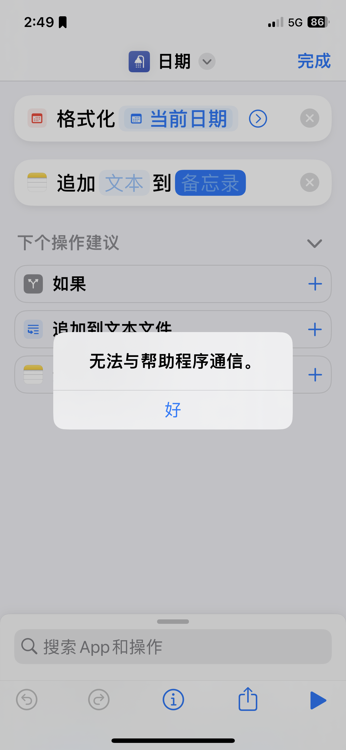 在我创建快捷指令的时候,当点到备忘录,就显示无法与帮助程序通讯。而之前却不这样,之前是直接让你选择打开的备忘录。