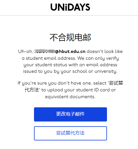 apple music 验证大学生身份的时候,输入的是我们学校的教育邮箱,但还是显示UNIDAYS 不合规电邮,这个教育邮箱都是可以正常登录的,而且我去年都是用这个邮箱验证的,今年就用不了了……