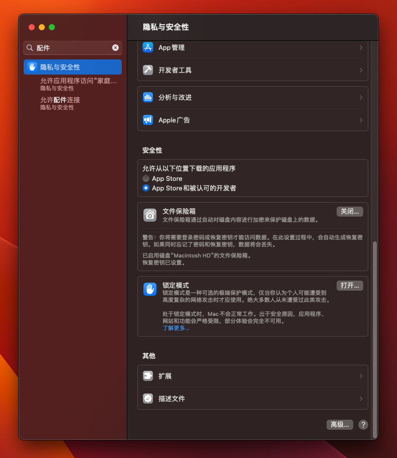 另外,“隐私与安全性”设置里面没有“允许配件连接”的选项。