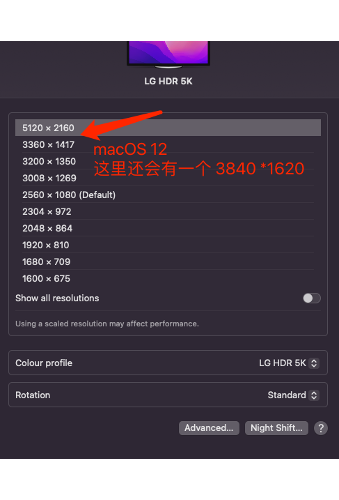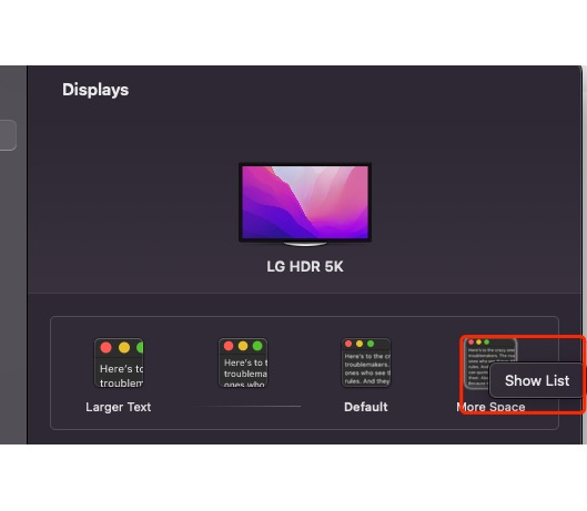 macOS 12 摁住option点击缩放,会有一个分辨率列表,而macOS 13 需要摁住ctrl 点击缩放选项会有一个分辨率列表,然而13的列表里也丢失我原来常用的分辨率