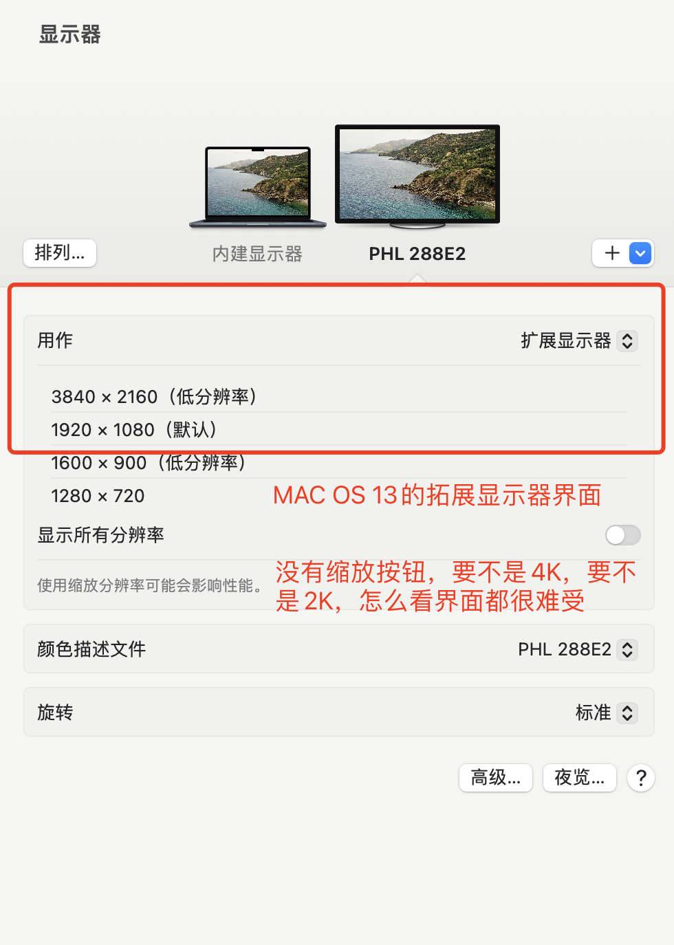 更新完Mac13 Ventura 正式版后,把外置显示器的缩放给取消了,导致我的4K显示器不能选择缩放,只能选择固定的分辨率,本身外置显示器,分辨率就没Mac的好,你就不能和 OS12 一样,给一个用户自己的选择吗?搞的我现在的4K显示器用起来,字体小的需要用放大镜看,用2K的时候,又看不清楚,不晓得系统OS的开发是怎么想的?我的4K显示器只能当2K用!!!!