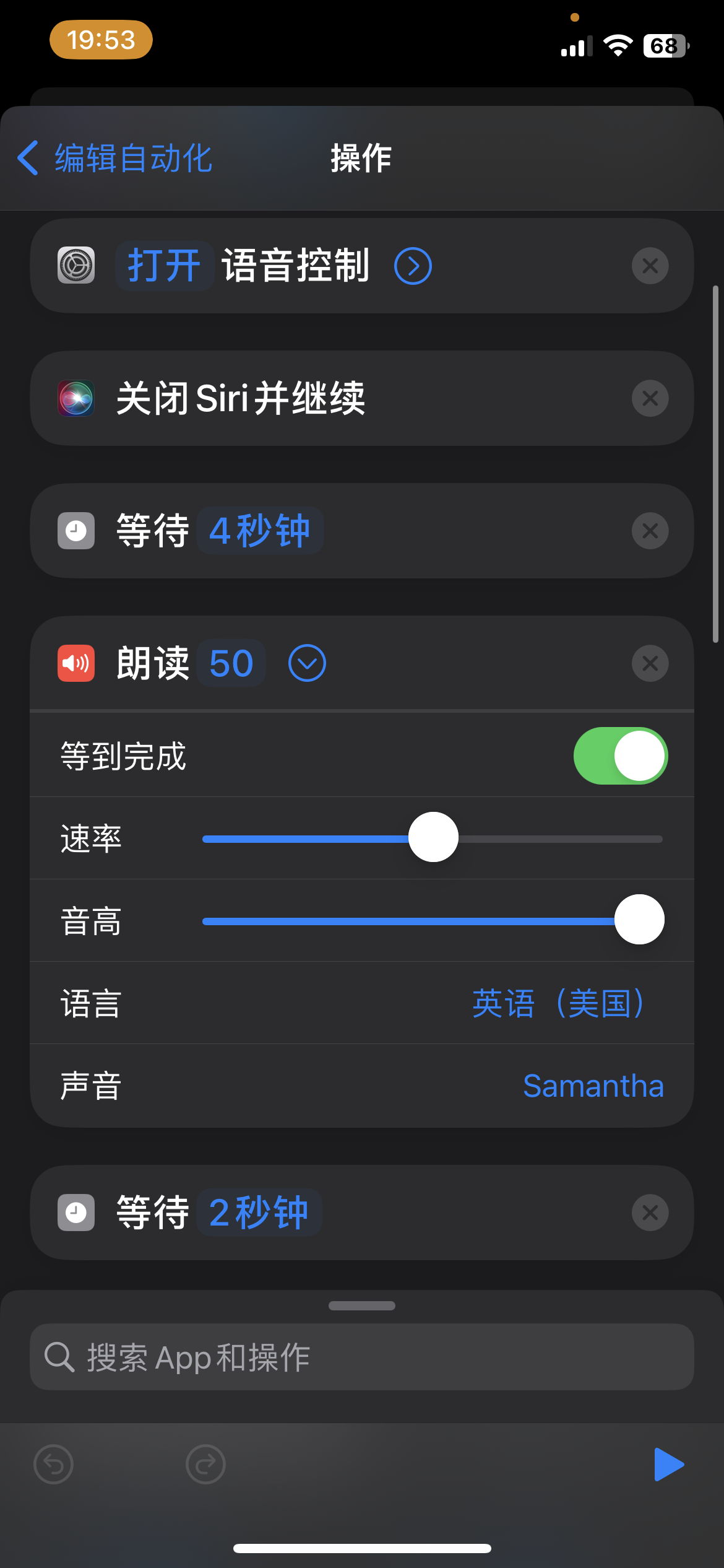 我利用快捷指令设置了开启语音控制(辅以叠层网格),并设定朗读相关网格数目,朗读语言已改为英文,但是仍旧无法触发语音控制。