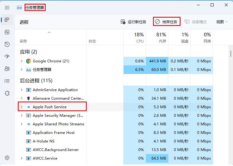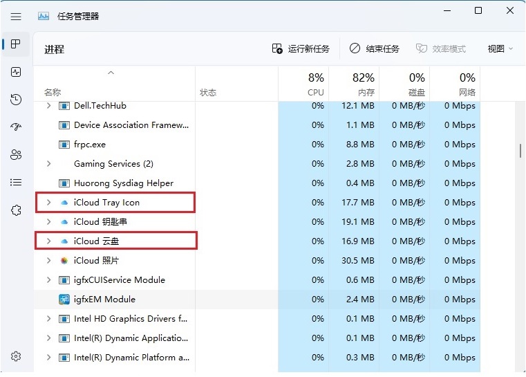 第一步:打开“任务管理器”,结束“Apple Push Service”、“iCloud 云盘”和“iCloud Tray Icon”.(关闭“iCloud Tray Icon”时桌边右下角标“iCloud图标”会消失)