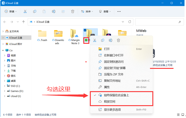 进入“iCloud云盘”,“右键”你想要实时同步的文件夹(想要时刻同步整个icloud云盘,则右键整个icloud云盘图标),选择 “始终保持在此设备”,即可。
