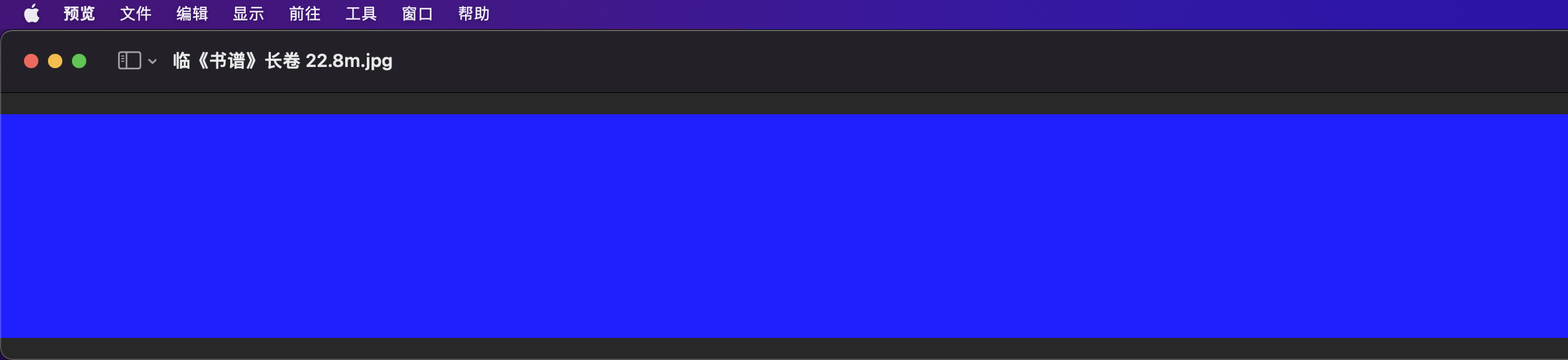 我用macOS(不同Mac的10.15.7或11.x或12.6.1)的【预览】打开尺寸较大的图片(例如64642x1874,无论是jpg或png格式),放大时图片即变成蓝色,无法观看。而在其它应用(如PS、PDF Expert以及Windows 11的【照片】)中打开、放大同一图片都正常。