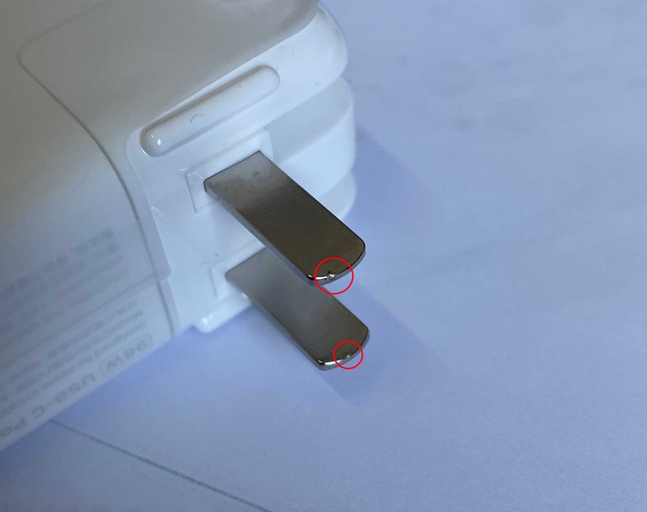 拔下充电头后发现变成了图片中的样子,好像有个小坑,插脚被电打掉了一块?