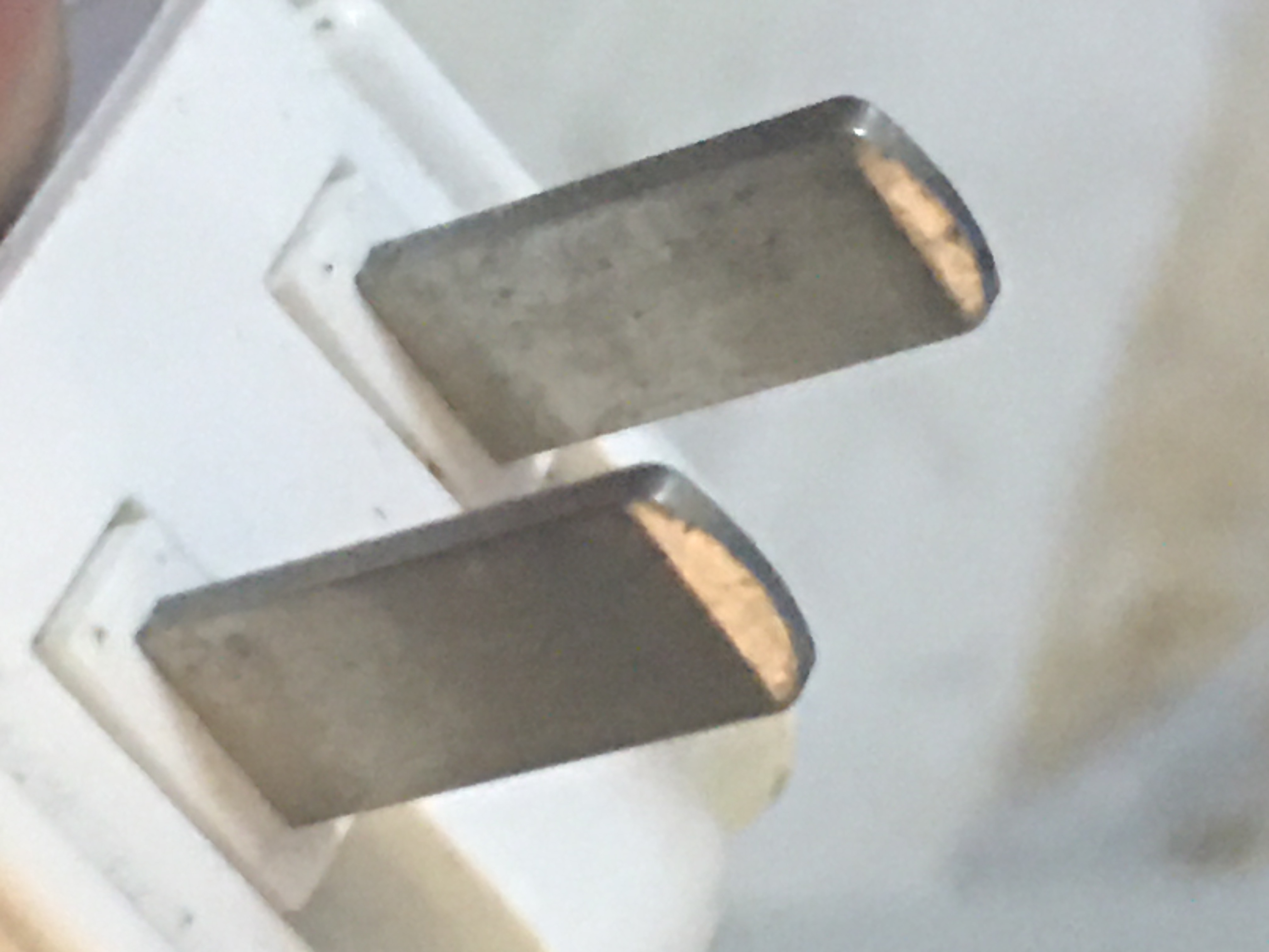 正常的插脚如图,每一面都应该是平整光滑的,如果没有把插头砸到地上这种损坏发生过的话,基本就能确定是那次电火花烧坏了插脚。