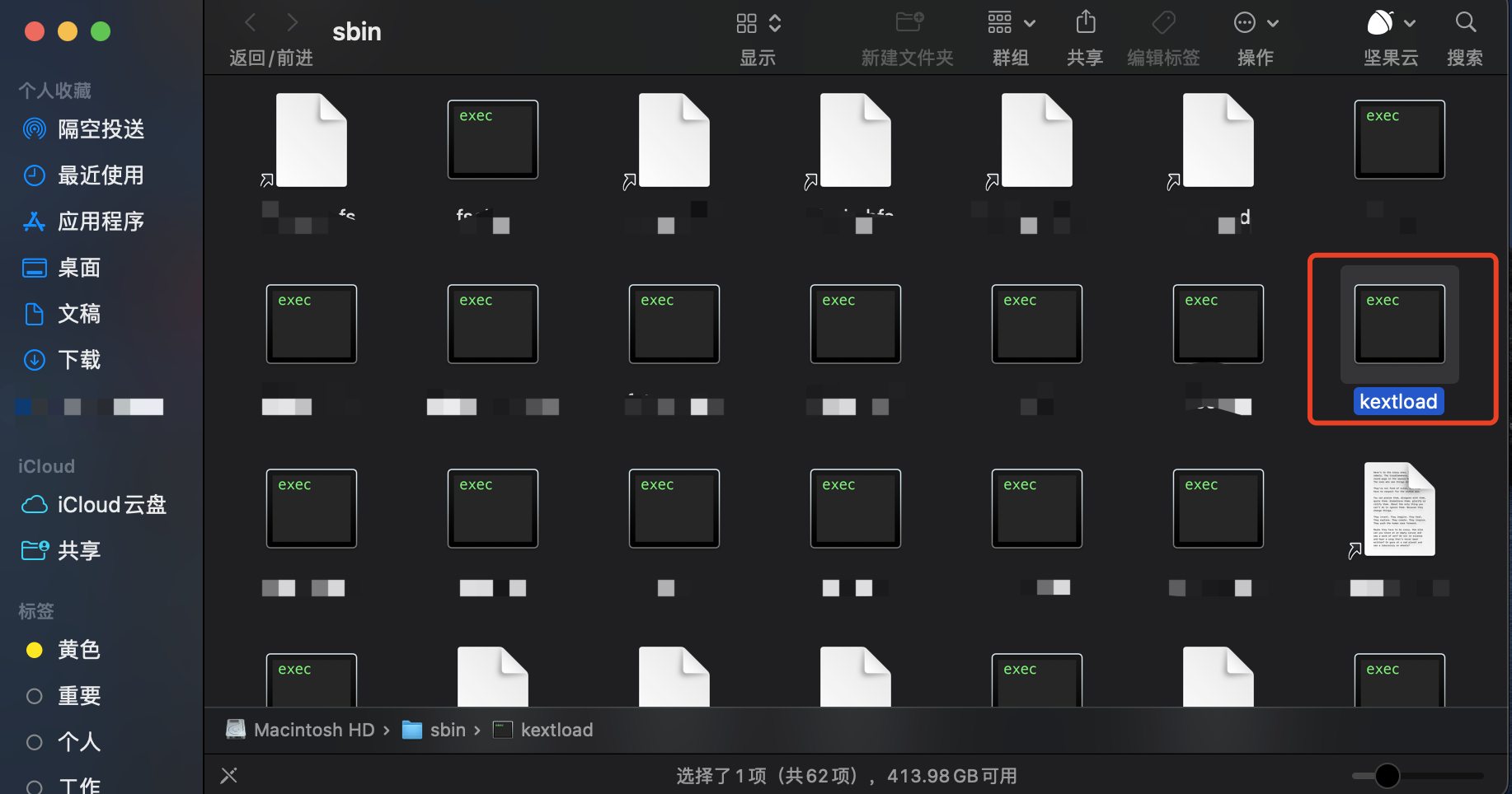 图2为点击右边的那个“i”图标,出现的该文件所在的文件夹/sbin/kextload