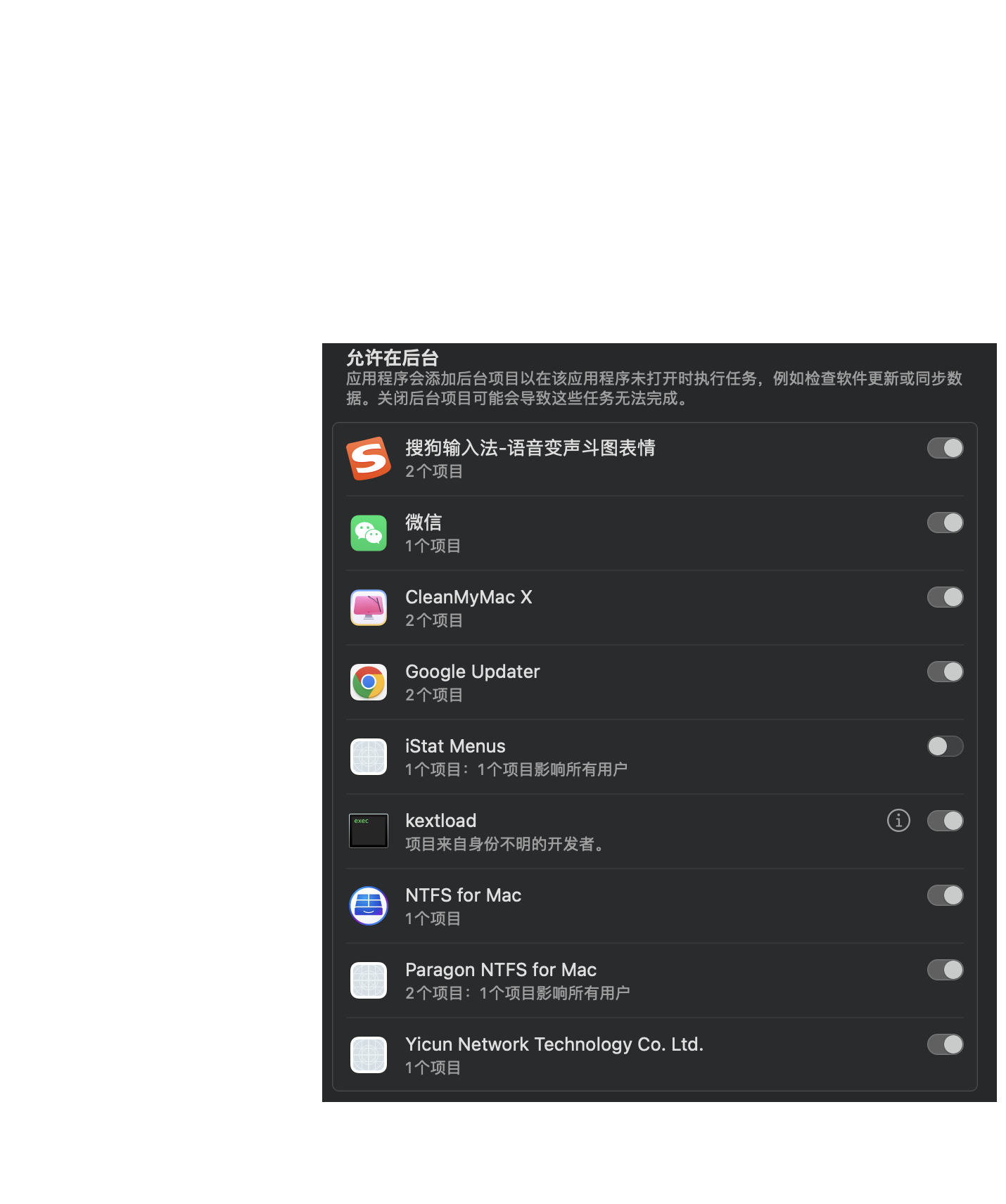 如图,我已经删除了istat menus程序,但是允许在后台列表中还是存在,烦请各位大神帮忙解答,谢谢!