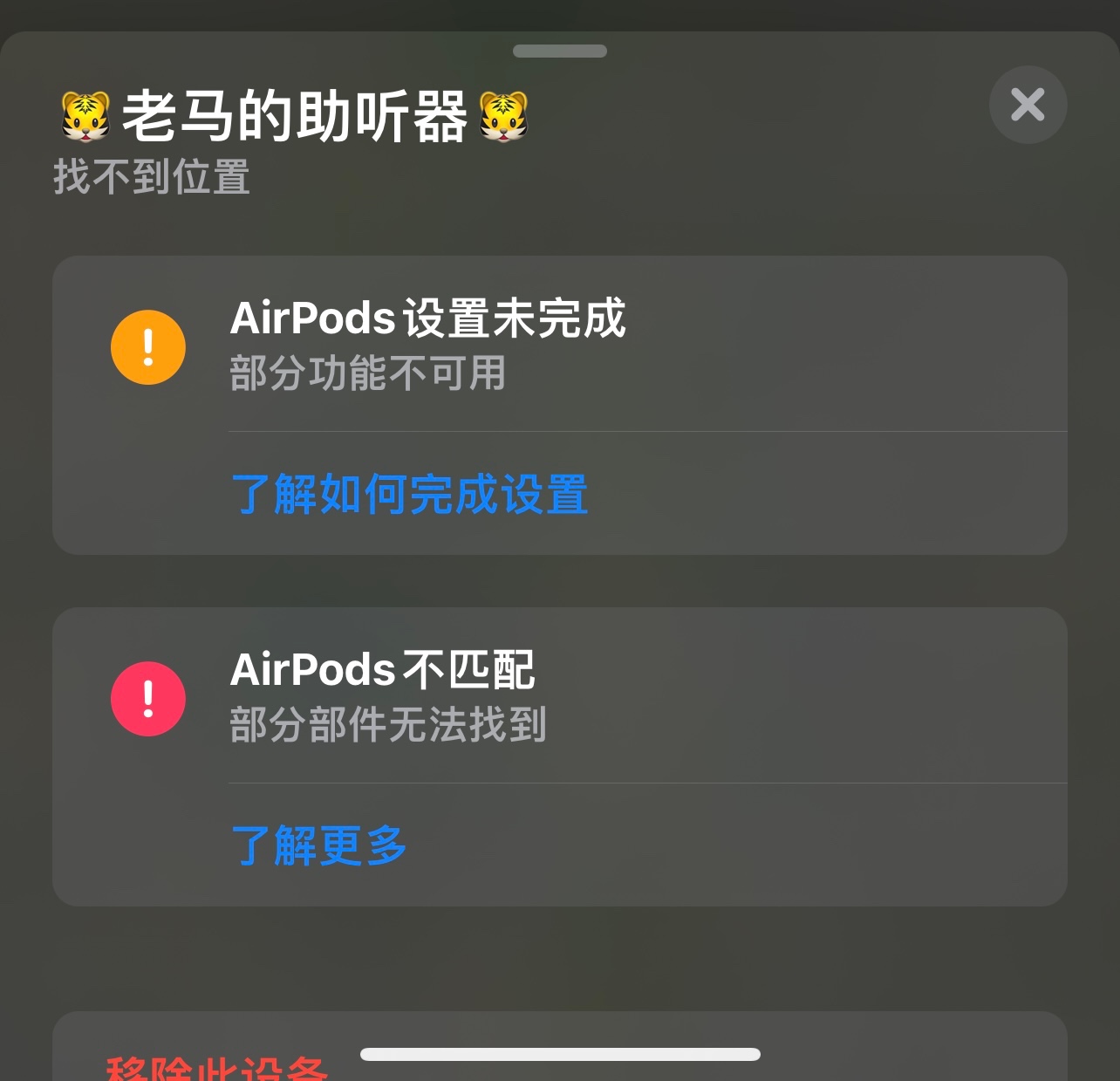 遇到过,我让原机主移除了查找网络就不会再提示不匹配了,移除设备必须链接AirPods