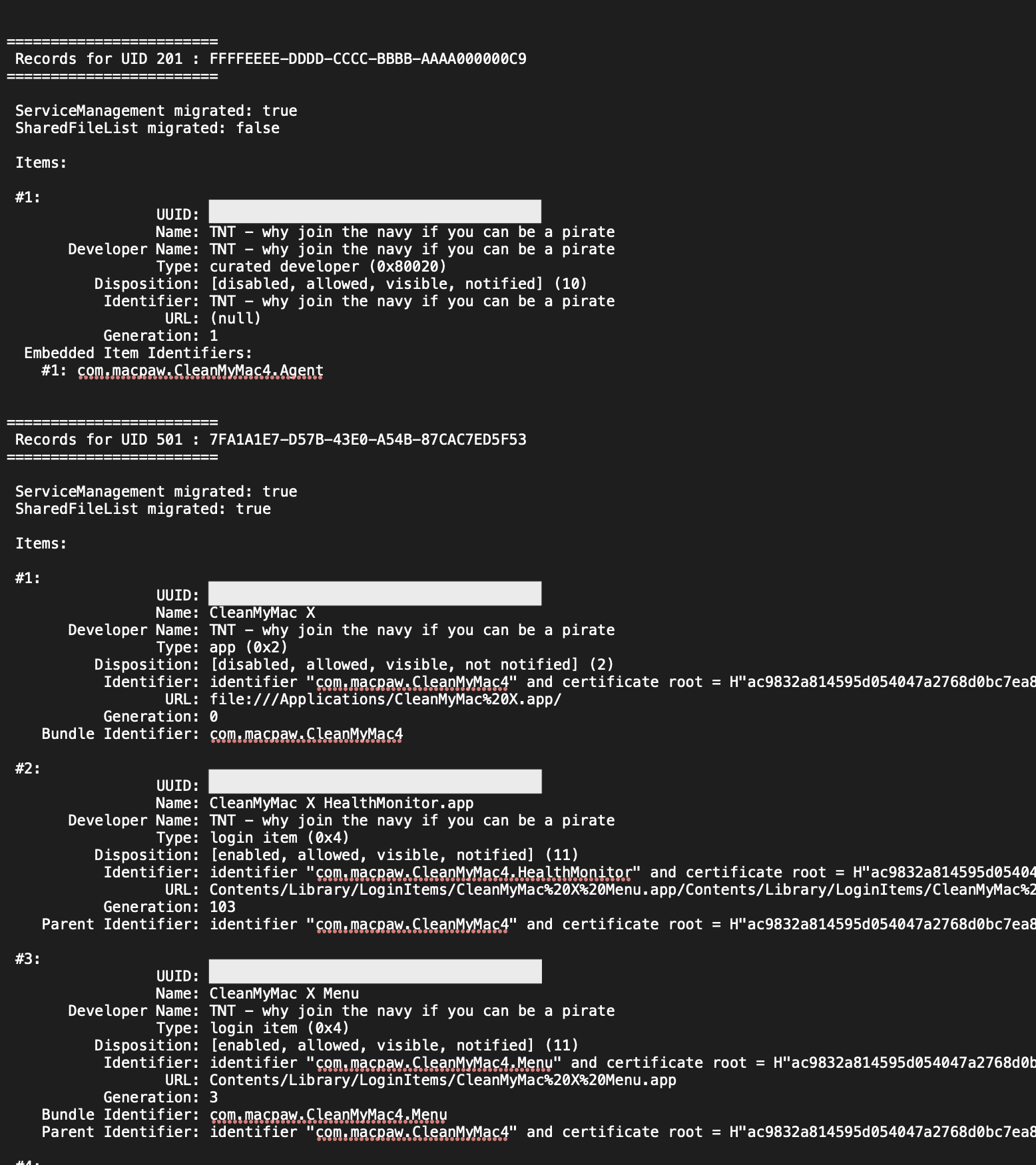 macOS Ventura 版本13.0.1,某软件卸载后,在“登录项-允许在后台”列表,仍有安装该软件时的全部三项内容残留。求助删除方法。