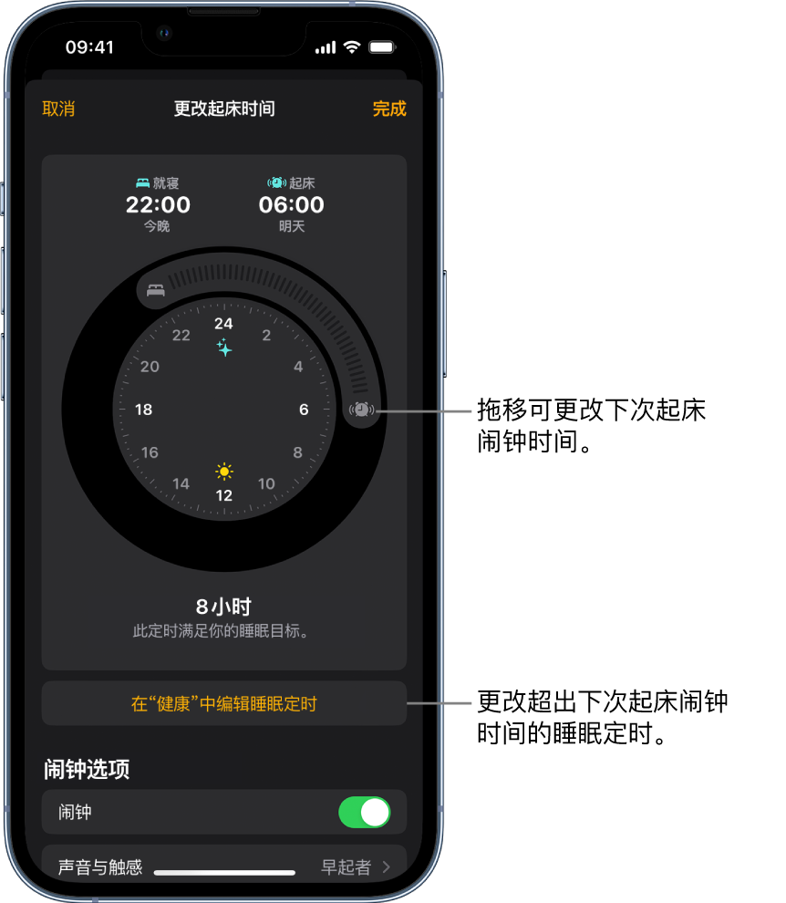 【注】你还可以在“健康” App 中设置作为完整睡眠定时(包括就寝时间、起床时间等)组成部分的起床闹钟。如果不想设置睡眠定时,你可以根据想要的起床时间在“时钟”中设定常规闹钟。