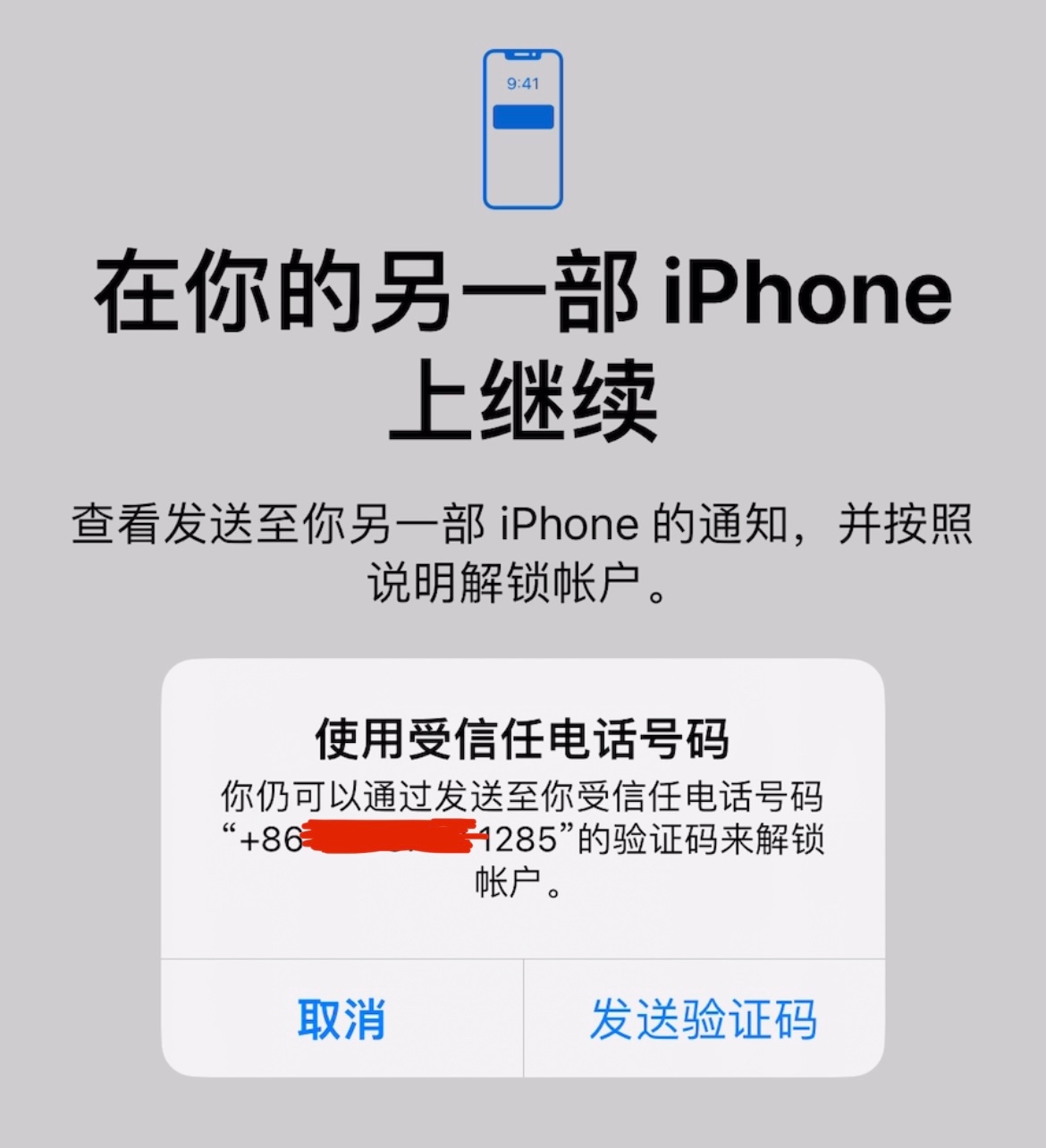我的ID被锁定,当我想要解锁账户时,苹果显示将我的另一部iphone上继续,让我查看另一部iphone上的通知说明解锁账户,我并没有另一部iphone这让我很疑惑,于是我点击无法使用我的另一部iphone,系统显示我可以通过发送至我的受信任号码的验证码来解锁,更奇怪的是受信任号码并不是我本人的手机号,但设置中显示的受信任号码却是我本人的,这是有人入侵了我的iphone吗?