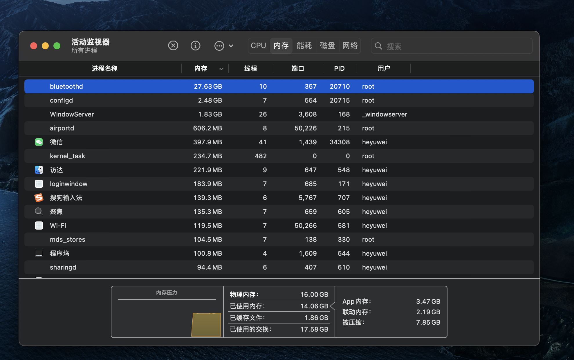Ventura在盒盖后耗电严重,且打开资源监视器可以看到bluetoothd进程伴随着严重的内存泄露.