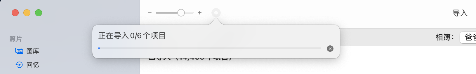 我想通过系统自带的“照片”应用把照片做备份(之前一直都是这么做的),但是这次进度条不会动了(如配图)。