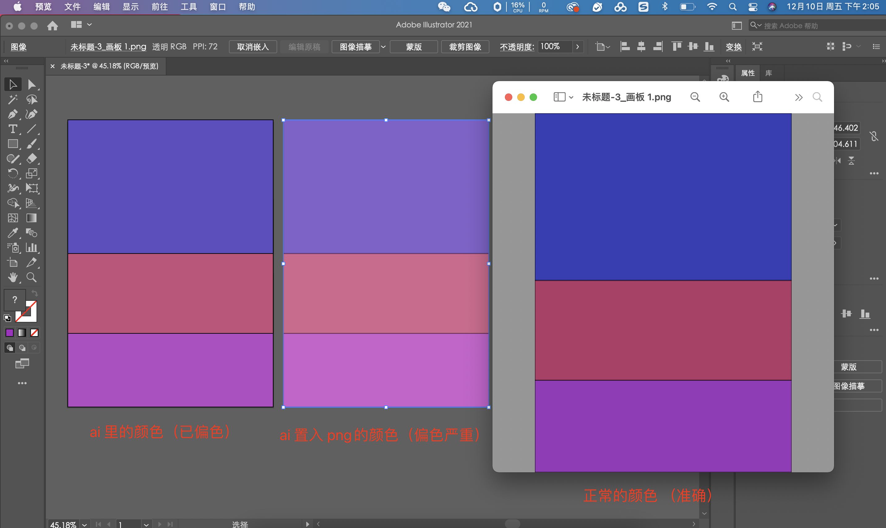 如图,ai里面不管用CPU GPU预览,还是RGB/CMYK模式预览,都是偏色严重, 置入图片的颜色也不准确,但是PS就不会。 有大佬能解决?