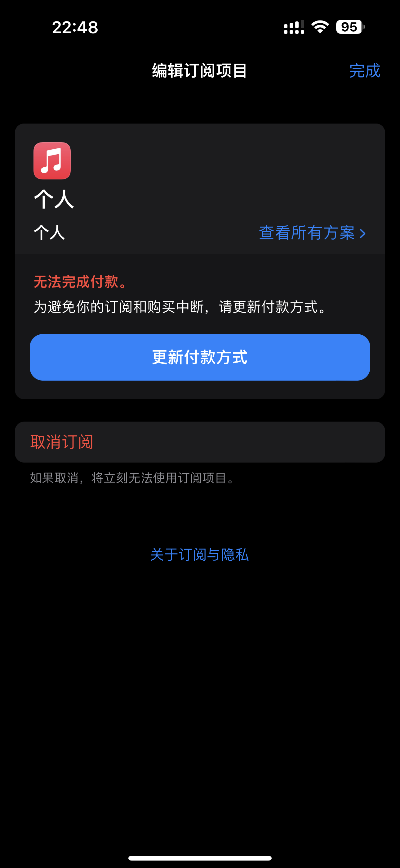 订阅的music个人年度会员并且成功付费了,为什么订阅里面会提示“无法完成付款 为避免你的购买和订阅中断请更新付款方式”