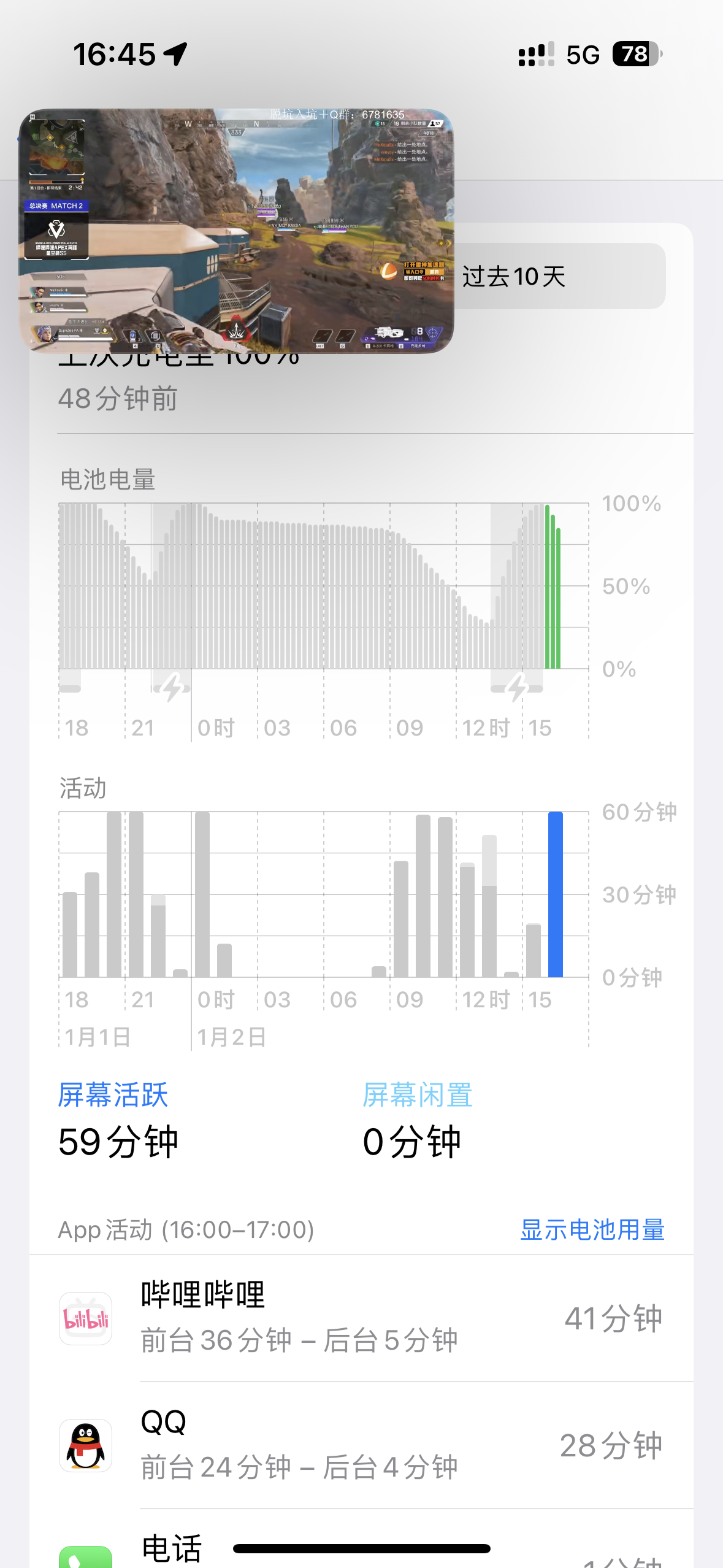 使用iPhone开启画中画并同时操作其它软件时,手机会异常发热,体感温度和大型游戏差不多(44-46度),即使只有视频软件和当前软件总共两个程序在运行也会如此,此时5v1a的充电器甚至无法维持当前电量,掉电速度加快,甚至会出现屏幕降亮度的情况,a16芯片低负载下的能耗比和6g运行内存我认为不应该出现这种情况,官方宣传的视频播放时间也和图中的掉电速度明显不符