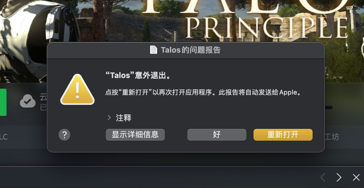 我了解到你在 Mac 上使用“Steam”App 打开游戏后,遇到了提示“Talos”意外退出的情况。由于暂时还没有其他社区用户来回复你的帖子,在此之前,建议你不妨先尝试以下操作步骤: