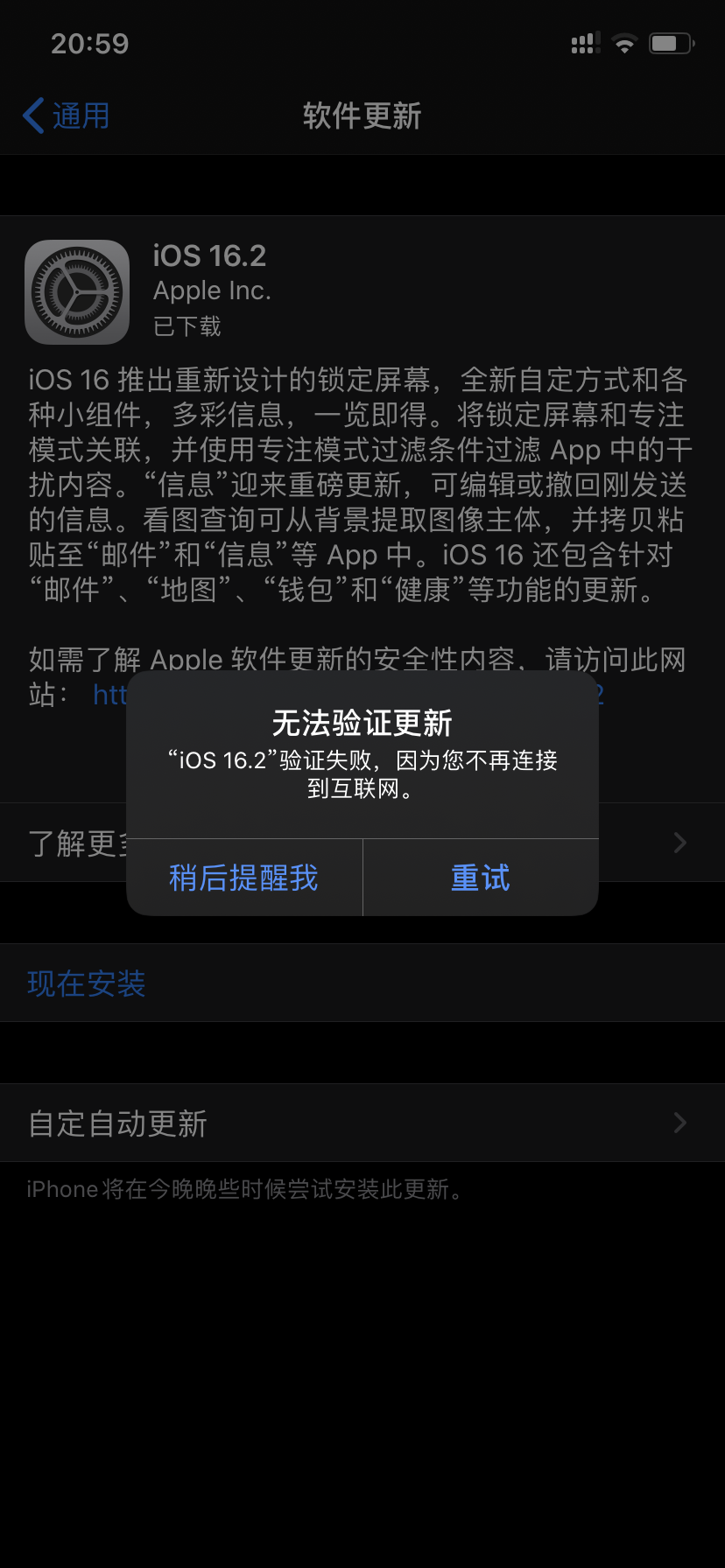 无法验证更新,因为不再连接到互联网