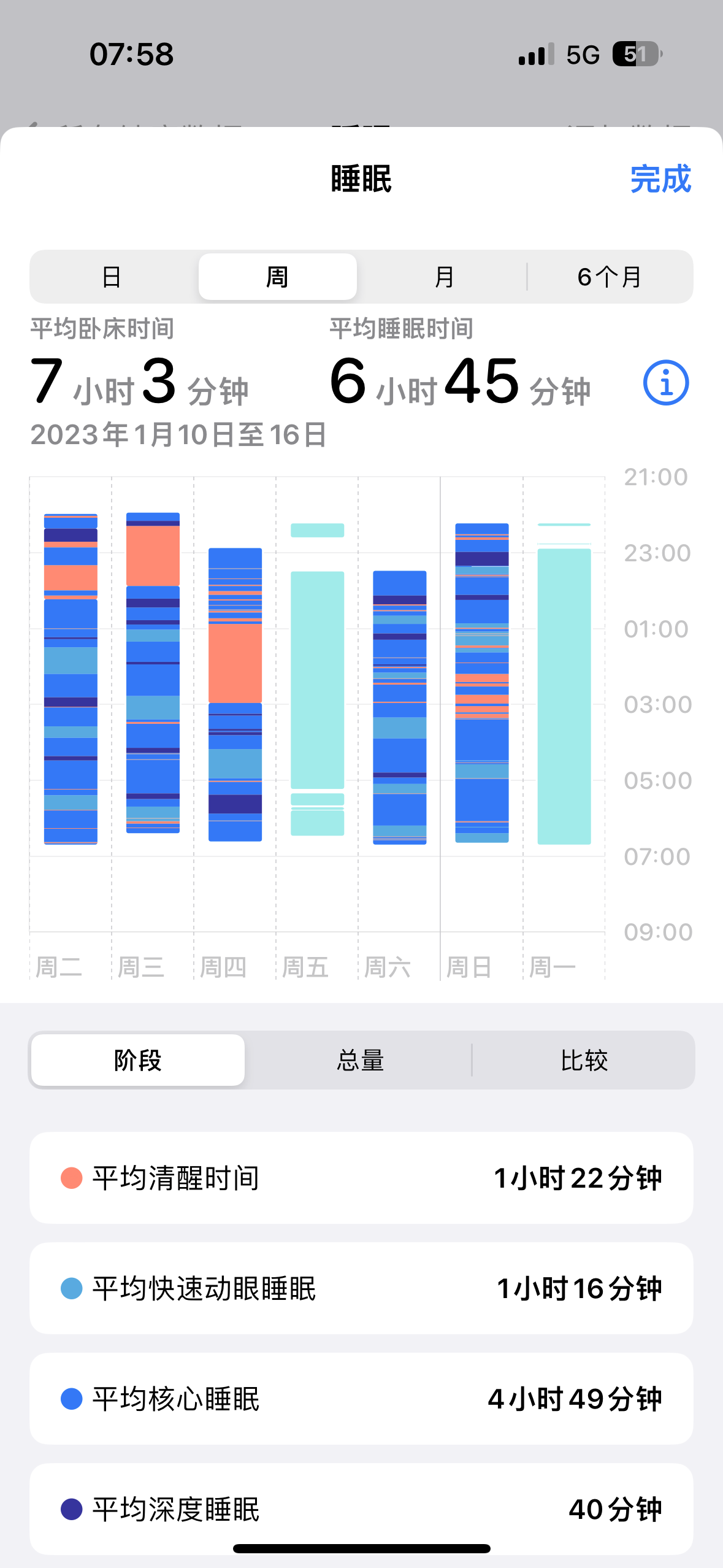 你需要在睡前将Apple Watch佩戴并解锁,才可以具体检测到晚上的睡眠。若没有佩戴Apple Watch或者未解锁,那么将会通过iPhone来跟踪你的睡眠时间(显示为浅蓝色),但是不会有具体的时期。